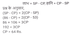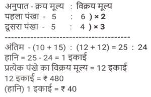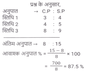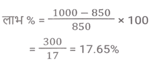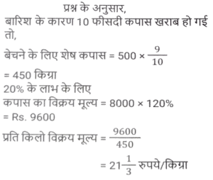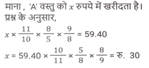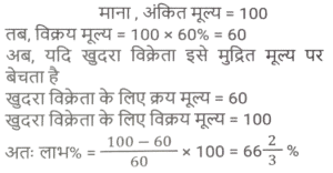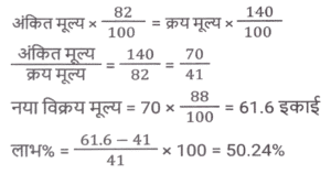 लाभ और हानि (SSC) (Part-III)Total Questions: 5031. एक खुदरा विक्रेता को एक वस्तु के अंकित मूल्य पर 40% की छूट मिलती है। यदि खुदरा विक्रेता इसे अंकित मूल्य पर बेचता है, तो उसका लाभ प्रतिशत कितना है? [SSC CHSL 05/07/2024 (3rd Shift)](a) 33⅓%(b) 37⅔%(c) 66⅓%(d) 66⅔%Correct Answer: (d) 66⅔%Solution:32. एक मोबाइल फोन व्यापारी एक फोन को ₹10,000 में खरीदता है और ₹12,000 में बेचता है। बाद में, उसे ज्ञात होता है कि वह इसे ₹13,000 में बेच सकता था। उसे कितने प्रतिशत की हानि होती है? [SSC CHSL 05/07/2024 (3rd Shift)](a) 10%(b) 20%(c) 15%(d) 25%Correct Answer: (a) 10%Solution:33. एक दुकानदार चावल खरीदते समय भार में 25% की बेईमानी करता है और बेचते समय 25% की बेईमानी करता है। यदि वह चावल को 12½ % लाभ पर बेचता है, तो उसका निवल लाभ प्रतिशत ज्ञात कीजिए। [SSC CHSL 05/07/2024 (4th Shift)](a) 92.5%(b) 82.5%(c) 87.5%(d) 62.5%Correct Answer: (c) 87.5%Solution:34. किसी वस्तु को ₹86 में बेचने पर अर्जित लाभ, उसी वस्तु को ₹53 में बेचने पर हुई हानि का दोगुना है। क्रय मूल्य ज्ञात कीजिए। [ SSC CHSL 08/07/2024 (2nd Shift)](a) ₹22(b) ₹33(c) ₹75(d) ₹64Correct Answer: (d) ₹64Solution:35. प्रदीप प्रत्येक ₹480 के मूल्य से दो पंखे बेचता है और ऐसा करके वह एक पंखे पर 20% का लाभ कमाता है और दूसरे पर उसे 20% की हानि होती है। कुल मिलाकर उसे कितनी हानि (₹ में) हुई? [SSC CHSL 08/07/2024 (3rd Shift)](a) 10(b) 40(c) 20(d) 30Correct Answer: (b) 40Solution:36. A, B को एक वस्तु 10% लाभ पर बेचता है, B उसी वस्तु को C को 60% लाभ पर बेचता है और C उसी वस्तु को D को 12½ % लाभ पर बेचता है। यदि D ने उस वस्तु के लिए ₹59.40 का भुगतान किया, तो A ने उसे किस मूल्य पर खरीदा? [SSC CHSL 08/07/2024 (4th Shift)](a) ₹30(b) ₹32(c) ₹34(d) ₹28Correct Answer: (a) ₹30Solution:37. एक व्यापारी ₹8,000 में 500 kg कपास खरीदता है। यदि बारिश के कारण इस कपास का 10% खराब हो जाता है, तो 20% लाभ अर्जित करने के लिए उसे शेष कपास को किस दर (₹/kg) पर बेचना चाहिए ? [ SSC CHSL 09/07/2024 (1st Shift)](a) 21 ⅓(b) 23 ⅓(c) 22 ⅓(d) 25 ⅓Correct Answer: (a) 21 ⅓Solution:38. एक दुकानदार अपने ग्राहकों को 22% की छूट देता है और फिर भी 36% का लाभअर्जित करता है। यदि दुकानदार के लिए वस्तु की लागत ₹1,092 हे, तो वस्तु का अंकित मूल्य (₹ में) ज्ञात कीजिए। [SSC CHSL 09/07/2024 (2nd Shift)](a) 1,792(b) 2,024(c) 1,904(d) 1,872Correct Answer: (c) 1,904Solution:39. एक बेईमान व्यापारी अपने माल को क्रय मूल्य पर बेचने का दावा करता है, परंतु वह 1 kg के स्थान पर 850 ग्राम के खोटे बाट का उपयोग करता है। उसके लाभ का प्रतिशत ज्ञात कीजिए। (दशमलव के दो स्थानों तक सही) [SSC CHSL 09/07/2024 (2nd Shift)](a) 17.56%(b) 17.65%(c) 17.45%(d) 17.54%Correct Answer: (b) 17.65%Solution:40. अंकित मूल्य पर 18% की छूट देने के बाद रमेश एक वस्तु को ₹34,440 में बेचता है और फिर भी 40% लाभ कमाता है। यदि रमेश अंकित मूल्य पर 12% की छूट के साथ वस्तु बेचता है, तो दशमलव के दो स्थानों तक उसका लाभकितना होगा? [SSC CHSL 09/07/2024 (3rd Shift)](a) 50.42%(b) 48.24%(c) 50.24%(d) 48.42%Correct Answer: (c) 50.24%Solution:Submit Quiz« Previous12345Next »