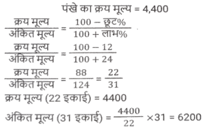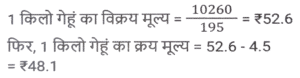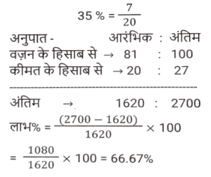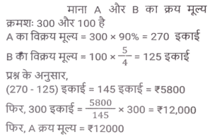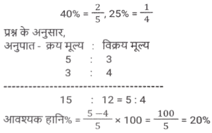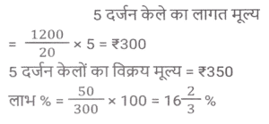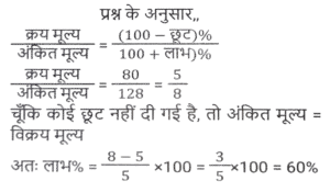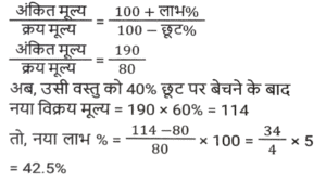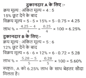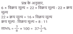 लाभ और हानि (SSC) (Part-III)Total Questions: 5041. 22 वस्तुओं को बेचकर, रोहित को 6 वस्तुओं का विक्रय मूल्य प्राप्त होता है। उसका लाभ प्रतिशत कितना है ? [SSC CHSL 09/07/2024 (4th Shift)](a) 37½ %(b) 37⅓ %(c) 33½ %(d) 33⅓ %Correct Answer: (a) 37½ %Solution:42. एक दुकानदार अंकित मूल्य पर 20% छूट पर एक वस्तु बेचता है और 90% का लाभ अर्जित करता है। यदि वह उसी वस्तु को 40% छूट पर बेचता है, तो उसका नया लाभ प्रतिशत क्या होगा? [SSC CHSL 09/07/2024 (4th Shift)](a) 48.2%(b) 45.8%(c) 42.5%(d) 41.8%Correct Answer: (c) 42.5%Solution:43. एक विक्रेता वास्तविक भार वाले बाट से 19% कम भार के बाट का उपयोग करके अपना माल बेचता है और 35% का लाभ अर्जित करता है। उसका निवल लाभ प्रतिशत (दशमलव के 2 स्थानों तक सन्निकटित) क्या है? [SSC CHSL 10/07/2024 (1st Shift)](a) 81.33%(b) 66.33%(c) 81.67%(d) 66.67%Correct Answer: (d) 66.67%Solution:44. दुकानदार A एक वस्तु का मूल्य 25% अधिक अंकित करता है और 15% की छूट देता है। उसी वस्तु पर एक दूसरे दुकानदार B द्वारा 20% अधिक मूल्य अंकित किया जाता है और 12% की छूट पर बेचा जाता है। % लाभ के मामले में किसे एक बेहतर डील मिलती है और वह उस वस्तु को कितने प्रतिशत लाभ में बेचता है? [SSC CHSL 10/07/2024 (2nd Shift)](a) A द्वारा 0.55%(b) B द्वारा 0.65%(c) B द्वारा 5.6%(d) A द्वारा 6.25%Correct Answer: (d) A द्वारा 6.25%Solution:45. एक विक्रेता 20 दर्जन केले ₹1,200 में खरीदता है और 5 दर्जन केले ₹350 में बेचता है, तो उसका लाभ प्रतिशत कितना है? [SSC CHSL 10/07/2024 (2nd Shift)](a) 15⅓ %(b) 16⅔ %(c) 13⅔ %(d) 21⅓ %Correct Answer: (b) 16⅔ %Solution:46. एक व्यापारी 195 kg गेहूं ₹4.50 प्रति किलोग्राम गेहूं के लाभ पर ₹10,260 में बेचता है। 15 kg गेहूं का क्रय मूल्य (₹ में, निकटतम पूर्णांक तक) क्या है? [SSC CHSL 10/07/2024 (3rd Shift)](a) 682(b) 750(c) 722(d) 595Correct Answer: (c) 722Solution:47. A का मूल्य B से तीन गुना है। A को 10% की हानि पर बेचा जाता है और B को इसके मूल्य 5/4 के भाग पर बेचा जाता है। यदि A का विक्रय मूल्य B के विक्रय मूल्य से ₹5,800 अधिक है, तो A का क्रय मूल्य कितना है? [SSC CHSL 10/07/2024 (4th Shift)](a) ₹12,000(b) ₹9,600(c) ₹15,000(d) ₹4,000Correct Answer: (a) ₹12,000Solution:48. एक वस्तु पर 20% की छूट देने के बाद प्रशांत उसे ₹2,160 में बेचता है और 28% का लाभ कमाता है। यदि वस्तु को बिना किसी छूट के बेचा जाए, तो लाभ कितना होगा? [SSC CHSL 11/07/2024 (1st Shift)](a) 50%(b) 55%(c) 65%(d) 60%Correct Answer: (d) 60%Solution:49. एक दुकानदार क्रय मूल्य पर 40% की हानि पर माल बेचता है लेकिन 25% कम भार का उपयोग करता है। उसका लाभ या हानि प्रतिशत क्या है? [SSC CHSL 11/07/2024 (1st Shift)](a) हानि, 10%(b) लाभ, 10%(c) हानि, 20%(d) लाभ, 20%Correct Answer: (c) हानि, 20%Solution:50. एक पंखे का क्रय मूल्य ₹4,400 है। एक व्यापारी इसे बेचकर 24% लाभ कमाना चाहता है। बिक्री के समय, व्यापारी अंकित मूल्य पर 12% की छूट की घोषणा करता है। अंकित मूल्य ज्ञात कीजिए। [SSC CHSL 11/07/2024 (3rd Shift)](a) ₹6,020(b) ₹2,060(c) ₹2,600(d) ₹6,200Correct Answer: (d) ₹6,200Solution:Submit Quiz« Previous12345
