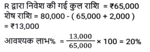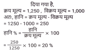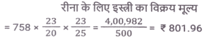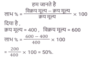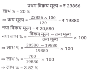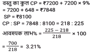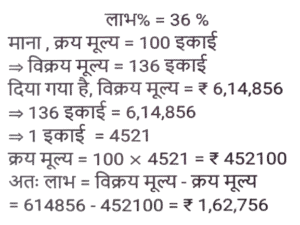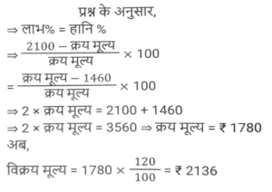 लाभ और हानि (SSC) (Part-IV)Total Questions: 5021. एक इस्त्री की कीमत ₹758 थी जिसे रमेश ने 15% के लाभ पर बेचा और इसे रीना ने 8% की हानि पर पुनः बेच दिया, जिसने इसे रमेश से खरीदा था। रीना के लिए इस्त्री का विक्रय मूल्य (दशमलव के दो स्थान तक सही) ज्ञात करें। [Matriculation Level 20/06/2024 (Shift-1)](a) ₹810.96(b) ₹808.69(c) ₹820.69(d) ₹801.96Correct Answer: (d) ₹801.96Solution:22. यदि एक मेज का क्रय मूल्य ₹400 और विक्रय मूल्य ₹600 है, तो लाभ प्रतिशत ज्ञात कीजिए। [Matriculation Level 20/06/2024 (Shift-4)](a) 55%(b) 45%(c) 33%(d) 50%Correct Answer: (d) 50%Solution:23. एक दुकानदार अपने क्रय मूल्य पर 36% लाभ की उम्मीद करता है। यदि एक महीने में उसकी बिक्री ₹6,14,856 थी, तो उसका लाभ (₹ में) कितना था? [Matriculation Level 20/06/2024 (Shift-4)](a) 1,61,235(b) 1,63,900(c) 1,62,756(d) 1,62,800Correct Answer: (c) 1,62,756Solution:24. एक सेल्समैन ₹1,250 में सामान खरीदता है और उसे ₹1,000 में बेचने के लिए मजबूर किया जाता है। उसका हानि प्रतिशत ज्ञात कीजिए। [Matriculation Level 20/06/2024 (Shift-4)](a) 25%(b) 20%(c) 30%(d) 15%Correct Answer: (b) 20%Solution:25. एक दुकानदार अपने सामान पर क्रय मूल्य से 20% अधिक मूल्य अंकित करता है और 10% की छूट देता है। उसका लाभ प्रतिशत क्या है? [Matriculation Level 21/06/2024 (Shift-1)](a) 10%(b) 6%(c) 8%(d) 4%Correct Answer: (c) 8%Solution:26. एक वस्तु को Rs.2,100 में बेचने पर अर्जित प्रतिशत लाभ उसी वस्तु को Rs. 1,460 में बेचने पर हुई प्रतिशत हानि के बराबर है। 20% लाभ कमाने के लिए वस्तु को किस कीमत पर बेचा जाना चाहिए? [Matriculation Level 21/06/2024 (Shift-1)](a) Rs.2,156(b) Rs.2,056(c) Rs.2,136(d) Rs.2,256Correct Answer: (c) Rs.2,136Solution:27. एक मोबाइल फोन को ₹23,856 में बेचने पर रमेश को 20% का लाभ होता है। यदि वह इसे ₹20,580 में बेचता है, तो उसका लाभ या हानि प्रतिशत (दशमलव के दो स्थान तक सही) ज्ञात करें। [Matriculation Level 21/06/2024 (Shift - 1)](a) 3.52% हानि(b) 5.32% लाभ(c) 3.52% लाभ(d) 5.32% हानिCorrect Answer: (c) 3.52% लाभSolution:28. एक बाल्टी को ₹680 में बेचने पर अर्जित लाभ, बाल्टी को ₹532 में बेचने पर हुई हानि के बराबर है। बाल्टी का क्रय मूल्य (₹ में) ज्ञात करें। [Matriculation Level 21/06/2024 (Shift-4)](a) 606(b) 612(c) 618(d) 610Correct Answer: (a) 606Solution:29. R, एक व्यवसाय में ₹65,000 का निवेश करता है और उसे कुल ₹80,000 वापस मिलते हैं। लाभ में से ₹2,000 व्यवसाय के व्यय के रूप में खर्च किए जाते हैं। व्यवसाय से उसका लाभप्रतिशत कितना है? [Matriculation Level 21/06/2024 (Shift-4)](a) 18%(b) 25%(c) 22%(d) 20%Correct Answer: (d) 20%Solution:30. एक दुकानदार ने ₹7,200 में एक वस्तु खरीदी और उसके क्रय मूल्य का 9% मरम्मत पर खर्च किया। उसने इसे राजन को ₹8,100 में बेच दिया। वस्तु को बेचने पर लाभ प्रतिशत क्या था? (दो दशमलव स्थानों तक पूर्णांकित) [Matriculation Level 21/06/2024 (Shift-4)](a) 2.91%(b) 3.12%(c) 3.21%(d) 12.5%Correct Answer: (c) 3.21%Solution:Submit Quiz« Previous12345Next »