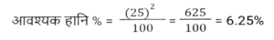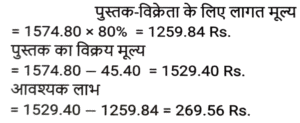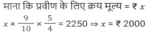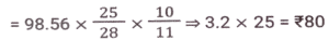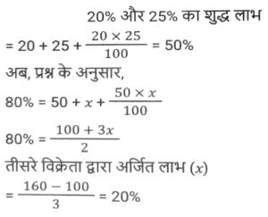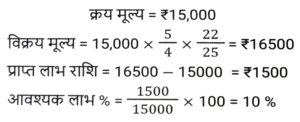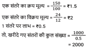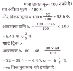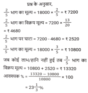 लाभ और हानि (SSC) (Part-V)Total Questions: 5031. एक दूध विक्रेता दूध में पानी मिलाता है और मिश्रण को क्रय मूल्य पर बेचकर 16¼ % का लाभ कमाता है। मिश्रण में दूध और पानी का अनुपात ज्ञात कीजिए। [SSC MTS 11/09/2023 (2nd Shift)](a) 7 : 40(b) 80 : 13(c) 13 : 80(d) 40 : 7Correct Answer: (b) 80 : 13Solution:32. एक विक्रेता ने एक सोफे का मूल्य उसके क्रय मूल्य से 25% अधिक अंकित किया। यदि वह ग्राहक को अंकित मूल्य पर 12% की छूट देता है, तो उसका लाभ प्रतिशत क्या है, साथ ही यदि सोफे का क्रय मूल्य ₹15,000 है, तो उसे कितनी धनराशि का लाभ हुआ? [SSC MTS 12/09/2023 (3rd Shift)](a) 9%, ₹1,480(b) 8%, ₹1,350(c) 10%, ₹1,500(d) 9.5%, ₹1,600Correct Answer: (c) 10%, ₹1,500Solution:33. कुछ संतरे ₹150 प्रति सैकड़ा पर खरीदे गए और ₹24 प्रति दर्जन पर बेचे गए। इससे ₹1,000 का लाभ हुआ। कितने संतरे खरीदे गए? [SSC MTS 13/09/2023 (1st Shift)](a) 3000(b) 2500(c) 1500(d) 2000Correct Answer: (d) 2000Solution:34. एक मेडिकल स्टोर के मालिक ने एक कंपनी से ₹18,000 की दवाएं खरीदी। वह दवा का 2/5 भाग 35% की हानि पर बेचता है। उसे शेष दवाइयां किस लाभ पर बेचनी चाहिए ताकि उसे न तो कोई लाभ हो और न ही हानि ? [SSC MTS 13/09/2023 (2nd Shift)](a) 23⅔ %(b) 20⅔ %(c) 20⅓ %(d) 23⅓ %Correct Answer: (d) 23⅓ %Solution:35. एक माइक्रोवेव और एक डिश वॉशिंग मशीन प्रत्येक को ₹27,000 के मूल्य पर बेचा गया। यदि माइक्रोवेव को 25% के लाभ पर और डिश वॉशिंग मशीन को 25% की हानि पर बेचा गया, तो पूरे लेन-देन पर कुल लाभ % या हानि % क्या है? [SSC MTS 13/09/2023 (3rd Shift)](a) 5.50% हानि(b) 7.75% लाभ(c) 6.25% हानि(d) 8.25% लाभCorrect Answer: (c) 6.25% हानिSolution:36. एक गहना 3 बार बेचा गया और कुल मिलाकर इसके मूल्य में 80% की वृद्धि हुई, पहला विक्रेता क्रमशः 20% लाभ अर्जित करता है और दूसरा विक्रेता 25% लाभ अर्जित करता है, तीसरे विक्रेता द्वारा अर्जित लाभ का प्रतिशत ज्ञात कीजिए? [SSC MTS 14/09/2023 (1st Shift)](a) 20%(b) 10%(c) 15%(d) 5%Correct Answer: (a) 20%Solution:37. प्रवीण जोया को 10% की हानि पर एक स्टडी टेबल बेचता है, और जोया उसी स्टडी टेबल को आदर्श को 25% के लाभ पर बेचती है। यदि आदर्श ने स्टडी टेबल ₹2,250 में खरीदी, तो प्रवीण के लिए स्टडी टेबल का मूल्य (₹ में) क्या था ? [SSC MTS 14/09/2023 (2nd Shift)](a) 2,000(b) 2,100(c) 1,800(d) 1,900Correct Answer: (a) 2,000Solution:38. एक कारखाने का मालिक उसके द्वारा निर्मित उत्पाद पर 12% अर्जित करता है। दुकानदार उसी वस्तु पर 10% का लाभ अर्जित करता है। यदि दुकानदार उत्पाद को ₹98.56 में बेचता है, तो कारखाने के मालिक के लिए उत्पाद का क्रय मूल्य ₹ __________ है। [SSC MTS 14/09/2023 (3rd Shift)](a) 88(b) 90(c) 84(d) 80Correct Answer: (d) 80Solution:39. एक दुकानदार अपने माल को क्रय मूल्य से 80% अधिक मूल्य पर अंकित करता है और अंकित मूल्य पर 48% की छूट देता है। उसका हानि प्रतिशत ज्ञात कीजिए। [SSC CHSL 02/08/2023 (1st Shift)](a) 2 ⅕ %(b) 7 ⅗ %(c) 6 ⅖ %(d) 3 ⅕ %Correct Answer: (c) 6 ⅖ %Solution:40. एक प्रकाशक एक पुस्तक-विक्रेता को ₹1,574.80 के अंकित मूल्य पर 20% की छूट देकर पुस्तकें बेचता है। यदि पुस्तक-विक्रेता अंकित मूल्य पर पुस्तकें बेचता है और उसका भाड़ा आदि पर व्यय ₹45.40 है। तो उसका लाभ ज्ञात कीजिए। [SSC CHSL 02/08/2023 (2nd Shift)](a) ₹285.34(b) ₹269.56(c) ₹273.50(d) ₹282.22Correct Answer: (b) ₹269.56Solution:Submit Quiz« Previous12345Next »