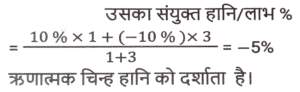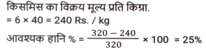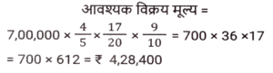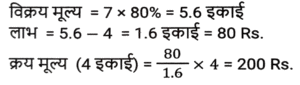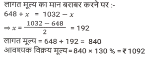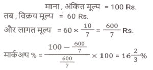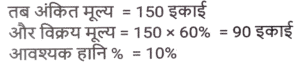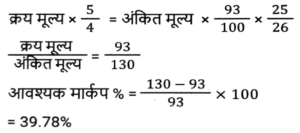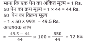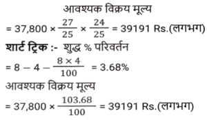 लाभ और हानि (SSC) (Part-V)Total Questions: 5041. S, ₹37,800 मूल्य की एक वस्तु P को 8% के लाभ पर बेचता है। P इसे 4% हानि के साथ Q को बेचता है। P किस मूल्य पर (₹ में) वस्तु बेचता है? (निकटतम रुपये तक सही) [SSC CHSL 02/08/2023 (3rd Shift)](a) 39,919(b) 39,119(c) 39,191(d) 39,911Correct Answer: (c) 39,191Solution:42. यदि एक व्यक्ति ₹320 प्रति किलोग्राम की दर से किसमिस खरीदता है और ₹6 में 25 ग्राम की दर से बेचता है, तो उसका लाभ / हानि प्रतिशत कितना है? [SSC CHSL 02/08/2023 (4th Shift)](a) 20% की हानि(b) 25% की हानि(c) 25% का लाभ(d) 20% का लाभCorrect Answer: (b) 25% की हानिSolution:43. एक वस्तु के क्रय मूल्य (CP) और अंकित मूल्य (MP) का अनुपात 4 : 7 है। वस्तु के MP पर 20% की छूट देने के बाद दुकानदार ₹ 80 का लाभ अर्जित करता है। वस्तु का CP ज्ञात कीजिए। [SSC CHSL 02/08/2023 (4th Shift)](a) ₹190(b) ₹170(c) ₹200(d) ₹180Correct Answer: (c) ₹200Solution:44. अप्रैल 2019 में, दिनेश ने ₹7,00,000 में एक नई कार खरीदी और अप्रैल 2022 में इसकी मूल्यह्रास लागत पर इसे बेच दिया। यदि पहले वर्ष में मूल्यह्रास की दर 20%, दूसरे वर्ष में 15% और उसके बाद हर वर्ष 10% है, तो विक्रय मूल्य के रूप में दिनेश को कितनी धनराशि मिलेगी? [SSC CHSL 03/08/2023 (1st Shift)](a) ₹4,28,400(b) ₹4,28,600(c) ₹4,68,400(d) ₹5,28,400Correct Answer: (a) ₹4,28,400Solution:45. एक वस्तु को ₹1,032 में बेचने से अर्जित लाभ, उसी वस्तु को ₹648 में बेचने पर हुई हानि के बराबर है। यदि लाभ 30% है तो वस्तु का विक्रय मूल्य क्या होना चाहिए ? [SSC CHSL 03/08/2023 (2nd Shift)](a) ₹2,520(b) ₹1,050(c) ₹1,092(d) ₹998Correct Answer: (c) ₹1,092Solution:46. एक व्यापारी अपने माल पर 40% की छूट देता है, लेकिन उसे उन पर 30% की हानि होती है। क्रय मूल्य से अधिक अंकित मूल्य का प्रतिशत ज्ञात कीजिए। [SSC CHSL 03/08/2023 (2nd Shift)](a) 15⅔ %(b) 15⅓ %(c) 16⅔ %(d) 16⅓ %Correct Answer: (c) 16⅔ %Solution:47. अलमारी का अंकित मूल्य ₹15,750 है, जो इसके क्रय मूल्य से 50% अधिक है। यदि इसे 40% की छूट पर बेचा जाता है। लाभ/हानि प्रतिशत क्या है? [SSC CHSL 03/08/2023 (3rd Shift)](a) लाभ, 10%(b) हानि, 10%(c) हानि, 20%(d) लाभ, 20%Correct Answer: (b) हानि, 10%Solution:48. एक विक्रेता एक निवेश पर 10% लाभ अर्जित करता है लेकिन एक दूसरे निवेश पर उसे 10% की हानि होती है। यदि दोनों निवेश 1:3 के अनुपात में हैं तो संयुक्त हानि या लाभ क्या होगा? [SSC CHSL 03/08/2023 (4th Shift)](a) 4% हानि(b) 5% लाभ(c) 4% लाभ(d) 5% हानिCorrect Answer: (d) 5% हानिSolution:49. एक फुटकर विक्रेता 44 कलमों के अंकित मूल्य पर 50 कलम खरीदता है। यदि वह इन कलमों को अंकित मूल्य पर 1% की छूट पर बेचता है, तो लाभ प्रतिशत क्या है? [SSC CHSL 04/08/2023 (2nd Shift)](a) 10%(b) 12.5%(c) 12%(d) 15%Correct Answer: (b) 12.5%Solution:50. एक डीलर अंकित मूल्य पर 7% की छूट देता है और हर 25 वस्तुओं की खरीद पर 1 वस्तु मुफ्त देता है और इस प्रकार 25% का लाभकमाता है। क्रय मूल्य से अधिक पर अंकित मूल्य में प्रतिशत वृद्धि ज्ञात कीजिए (दशमलव के दो स्थानों तक)। [SSC CHSL 04/08/2023 (3rd Shift)](a) 39.78%(b) 37.88%(c) 1.4%(d) 38.87%Correct Answer: (a) 39.78%Solution:Submit Quiz« Previous12345