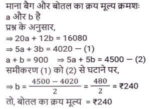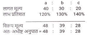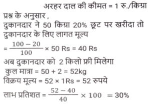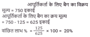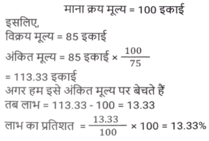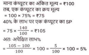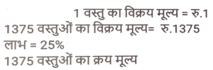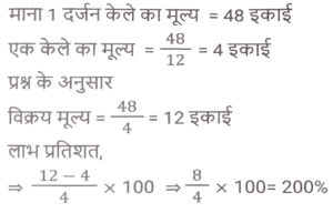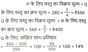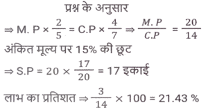 लाभ और हानि (SSC) (Part-VII)Total Questions: 5041. P एक वस्तु को Rs.280 में खरीदता है और उसे Q को 25% के लाभ पर बेचता है। Q किसी लाभ पर इसे R को बेचता है। R इसे S को Rs.560 में बेचता है और 40% का लाभ प्राप्त करता है। Q ने कितना प्रतिशत लाभ (निकटतम पूर्णांक तक पूर्णांकित) अर्जित किया? [Graduate Level 05/08/2022 (Shift - 3)](a) 26 प्रतिशत(b) 14 प्रतिशत(c) 32 प्रतिशत(d) 20 प्रतिशतCorrect Answer: (b) 14 प्रतिशतSolution:42. एक मल्टी-स्टोर आउटलेट ने एक हफ्ते में 1375 आइटम बेचे और 25% लाभ अर्जित किया। लाभ 'Q' संख्या में वस्तुओं के विक्रय मूल्य के बराबर भी है। 'Q' का मान क्या है? [Higher Secondary 02/08/2022 (Shift-2)](a) 250(b) 325(c) 225(d) 275Correct Answer: (d) 275Solution:43. एक दुकानदार, आपूर्तिकर्ता से माल खरीदता है। 125 बैगों के बिक्री मूल्य के बराबर लाभ अर्जित करते हुए आपूर्तिकर्ता दुकानदार को 750 बैग बेचता है। आपूर्तिकर्ता का लाभ प्रतिशत क्या है? [Higher Secondary 04/08/2022 (Shift-3)](a) 16%(b) 20%(c) 22%(d) 15%Correct Answer: (b) 20%Solution:44. एक दुकानदार तीन उत्पाद a, b, c खरीदता है और उन्हें क्रमशः 20%, 30%, 40% लाभ पर बेचता है। यदि इन उत्पादों के क्रय मूल्य का अनुपात 4 : 3 : 2 है, तो इनके विक्रय मूल्यों का अनुपात क्या होगा? [SSC MTS 05/07/2022 (Morning)](a) 34:54:12(b) 48:39:28(c) 56:26:21(d) 24:39:14Correct Answer: (b) 48:39:28Solution:45. रणवीर ने एक कंप्यूटर सूची मूल्य से 25% कम मूल्य पर खरीदा और अपने पड़ोसी को उसकी क्रय मूल्य के 40% लाभ पर बेच दिया। कंप्यूटर के सूची मूल्य पर रनवीर द्वारा अर्जित लाभ प्रतिशत ज्ञात कीजिए। [SSC MTS 05/07/2022 (Evening)](a) 10%(b) 7.5%(c) 6.67%(d) 5%Correct Answer: (d) 5%Solution:46. A ने कुल ₹900 में एक बैग और एक बोतल खरीदी। उसने बोतल को 12% के लाभ पर और बैग को 20% के लाभ पर बेचा। यदि उसने कुल ₹160.80 का लाभ अर्जित किया, तो बोतल का क्रय मूल्य ज्ञात कीजिए। [SSC MTS 07/07/2022 (Morning)](a) ₹320(b) ₹300(c) ₹200(d) ₹240Correct Answer: (d) ₹240Solution:47. यदि किसी वस्तु पर 25% की छूट दी जाती है, तो 15% की हानि होगी। यदि वस्तु को उसके अंकित मूल्य पर बेचा जाता है, तो लाभप्रतिशत क्या होगा? [अपना उत्तर 2 दशमलव स्थानों तक सही दें। [SSC MTS 11/07/2022 (Morning)](a) 15.66%(b) 12.66%(c) 13.33%(d) 10.22%Correct Answer: (c) 13.33%Solution:48. एक व्यक्ति कुछ केले ₹Y प्रति दर्जन की दर से खरीदता है और उन्हें ₹ Y/4 प्रति केले की दर से बेचता है। उसका लाभ प्रतिशत क्या है ? [SSC MTS 11/07/2022 (Evening)](a) 200%(b) 50%(c) 80%(d) 100%Correct Answer: (a) 200%Solution:49. किसी वस्तु के अंकित मूल्य का 2/5 उसके क्रय मूल्य के 4/7 के बराबर है। यदि इसकी बिक्री पर 15% की छूट दी जाती है, तो अर्जित लाभ का अनुमानित प्रतिशत क्या है? [SSC MTS 11/07/2022 (Evening)](a) 19.84%(b) 23.63%(c) 21.43%(d) 14.28%Correct Answer: (c) 21.43%Solution:50. एक फुटकर विक्रेता ने 50 किग्रा अरहर दाल 20% की छूट पर खरीदी। 50 किलो दाल की खरीद पर थोक व्यापारी द्वारा उन्हें 2 किलो अरहर की दाल मुफ्त में देने की पेशकश की गई। यदि फुटकर विक्रेता दाल की पूरी मात्रा एक ग्राहक को अंकित मूल्य पर बेचता है, तो फुटकर विक्रेता को प्राप्त लाभ प्रतिशत क्या है? [SSC MTS 13/07/2022 (Morning)](a) 30%(b) 22%(c) 12%(d) 15%Correct Answer: (a) 30%Solution:Submit Quiz« Previous12345