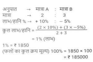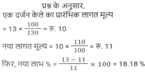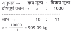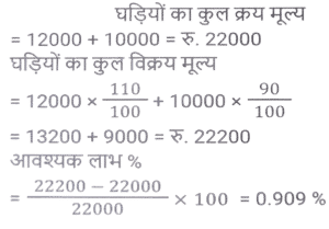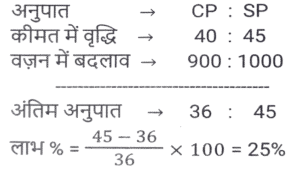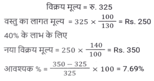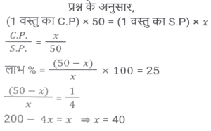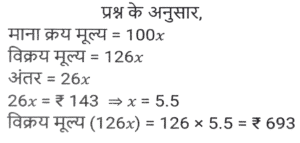 लाभ और हानि (SSC) (Part-VI)Total Questions: 5041. एक बेईमान दुकानदार Rs.45 प्रति किलोग्राम की दर से चीनी बेचता है। चीनी का क्रय मूल्य Rs.40 प्रति किलोग्राम है। ऐसा करने के बाद भी वह 1 kg के प्रत्येक पैकेट से 100 gm चीनी निकालकर अपना मुनाफा बढ़ाने की कोशिश करता है। दुकानदार का लाभ प्रतिशत कितना है? [SSC MTS 08/05/2023 (Afternoon)](a) 30%(b) 35%(c) 20%(d) 25%Correct Answer: (d) 25%Solution:42. एक बेईमान दुकानदार अपने माल को क्रय मूल्य पर बेचने का दावा करता है लेकिन खोटे बाट (false weights) का उपयोग करके 10% का लाभ अर्जित करता है। वह 1 kg भार के स्थान पर किस बाट का उपयोग कर रहा है? [SSC MTS 09/05/2023 (Afternoon)](a) 909.09 gm(b) 900 gm(c) 920.30 gm(d) 911.12 gmCorrect Answer: (a) 909.09 gmSolution:43. यदि 9 बक्सों का विक्रय मूल्य 15 बक्सों के क्रय मूल्य के बराबर है। लाभ प्रतिशत है (सभी बक्सों का विक्रय मूल्य समान है। सभी बक्सों का क्रय मूल्य समान है): [SSC MTS 11/05/2023 (Evening)](a) (50/3)%(b) (200/3)%(c) (100/3)%(d) (140/3)%Correct Answer: (b) (200/3)%Solution:44. विजय Rs. 13 प्रति दर्जन की दर से केले बेचता है और 30 प्रतिशत का लाभ अर्जित करता है। केले के क्रय मूल्य में 10 प्रतिशत की वृद्धि हो जाती है। यदि विक्रय मूल्य वही रहता है, तो उसका नया लाभ प्रतिशत क्या है? [SSC MTS 12/05/2023 (Afternoon)](a) 16.66%(b) 18.18%(c) 14.28%(d) 12.5%Correct Answer: (b) 18.18%Solution:45. क्रय मूल्य और विक्रय मूल्य के बीच Rs. 143 का अंतर है। यदि लाभ प्रतिशत 26 प्रतिशत है, तो विक्रय मूल्य क्या है? [SSC MTS 15/05/2023 (Morning)](c) Rs. 693(b) Rs. 676(c) Rs. 693(d) Rs. 713Correct Answer: (c) Rs. 693Solution:46. 50 वस्तुओं का क्रय मूल्य, x वस्तुओं के विक्रय मूल्य के समान है। यदि 25 प्रतिशत का लाभ होता है, तो x का मान क्या है? (सभी वस्तुओं का विक्रय मूल्य समान है। सभी वस्तुओं का क्रय मूल्य भी समान है) [SSC MTS 16/05/2023 (Morning)](a) 20(b) 40(c) 30(d) 25Correct Answer: (b) 40Solution:47. एक व्यक्ति को 40 रुपये में 80 पेन बेचने पर 20 प्रतिशत की हानि होती है। 10 प्रतिशत का लाभ अर्जित करने के लिए 80 पेन का विक्रय मूल्य क्या होना चाहिए? [SSC MTS 17/05/2023 (Morning)](a) 80 रुपये(b) 60 रुपये(c) 55 रुपये(d) 65 रुपयेCorrect Answer: (c) 55 रुपयेSolution:48. शिवम ने दो घड़ियाँ खरीदीं, पहली Rs. 12000 में और दूसरी Rs. 10000 में। उसने दोनों घड़ियों को बेच दिया, पहली को 10 प्रतिशत के लाभ पर और दूसरी को 10 प्रतिशत की हानि पर। उसे कुल कितना लाभ या हानि हुई? [SSC MTS 19/05/2023 (Morning)](a) 2.25% लाभ(b) 2.25% हानि(c) 0.909% लाभ(d) 0.909% हानिCorrect Answer: (c) 0.909% लाभSolution:49. एक फल विक्रेता फलों के 2/5 भाग को 10% के लाभ पर और शेष को 5% की हानि पर बेचता है। यदि कुल लाभ Rs. 1850 है, तो फलों का कुल क्रय मूल्य कितना है? [SSC MTS 19/05/2023 (Afternoon)](a) Rs.198000(b) Rs.205000(c) Rs.185000(d) Rs.176000Correct Answer: (c) Rs.185000Solution:50. एक व्यक्ति एक वस्तु को Rs.325 में बेचकर 30 प्रतिशत का लाभ अर्जित करता है। 40 प्रतिशत का लाभ अर्जित करने के लिए उसे अपने विक्रय मूल्य में कितने प्रतिशत की वृद्धि करनी होगी ? [SSC MTS 19/05/2023 (Evening)](a) 6.66 प्रतिशत(b) 8.25 प्रतिशत(c) 7.69 प्रतिशत(d) 5.25 प्रतिशतCorrect Answer: (c) 7.69 प्रतिशतSolution:Submit Quiz« Previous12345