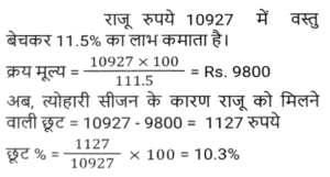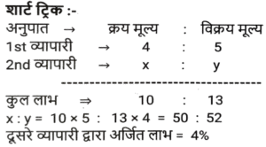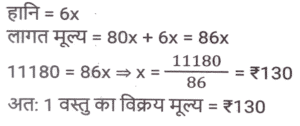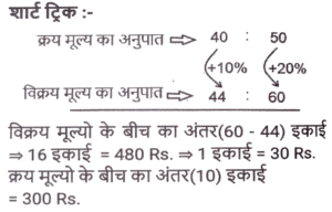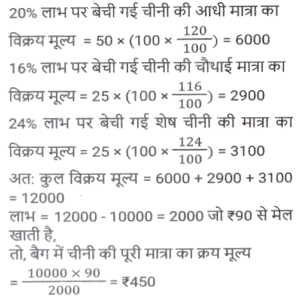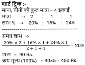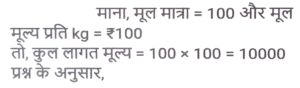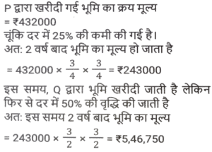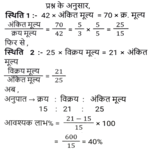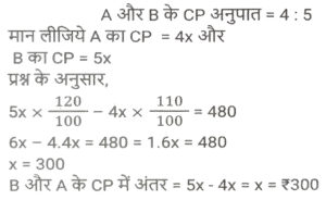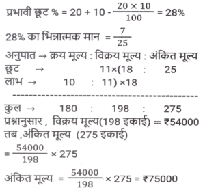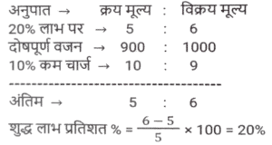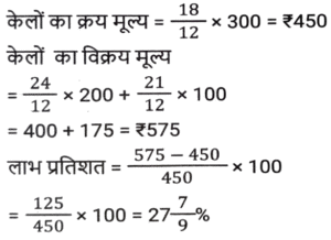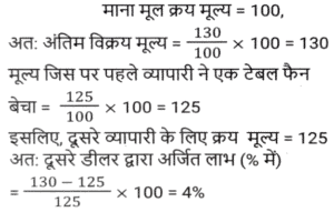 लाभ और हानि (SSC) (Part-VIII)Total Questions: 3811. एक आदमी P ने एक शहर के बाहरी इलाके में ₹4,32,000 में एक जमीन खरीदी। किसी कारण से, इसके मूल्य का 25% प्रति वर्ष की दर से ह्रास हुआ और उसने इसे 2 वर्ष बाद Q को बेच दिया। इस समय, शहर का विस्तार हुआ और बुनियादी ढांचे की नई परियोजनाएं सामने आने लगीं। विस्तार के परिणामस्वरूप, अचल संपत्ति की कीमतों में 50% की वृद्धि हुई। Q द्वारा P से भूमि खरीदने के 2 वर्ष बाद भूमि का मूल्य (₹ में) क्या होगा? [SSC CHSL 24/05/2022 (Afternoon)](a) ₹5,46,750(b) ₹5,57,450(c) ₹5,76,450(d) ₹6,05,070Correct Answer: (a) ₹5,46,750Solution:12. कमल ₹11,180 में 80 वस्तुएँ खरीदता है और उन्हें 6 वस्तुओं के विक्रय मूल्य के बराबर हानि पर बेचता है। 1 वस्तु का विक्रय मूल्य क्या होगा? [SSC CHSL 25/05/2022 (Morning)](a) ₹130(b) ₹120(c) ₹135(d) ₹125Correct Answer: (a) ₹130Solution:13. तराजू में हुई खराबी के कारण 1 kg के बजाय 900 g तौलने की वजह से एक दुकानदार एक निश्चित लेनदेन में समान्यतः 20% का लाभ कमाता है; यदि वह वस्तु के मूल्य को सामान्य मूल्य से 10% कम कर देता है, तो उसका वास्तविक लाभ या हानि प्रतिशत ज्ञात कीजिए। [SSC CHSL 27/05/2022 (Morning)](a) 20%(b) 28%(c) 25%(d) 30%Correct Answer: (a) 20%Solution:14. एक फल विक्रेता ने 300 केले ₹18 प्रति दर्जन की दर से खरीदे। उसने 200 केले ₹24 प्रति दर्जन की दर से बेचे तथा शेष केले ₹21 प्रति दर्जन की दर से बेचे। उसका शुद्ध लाभ प्रतिशत क्या है ? [SSC CHSL 31/05/2022 (Evening)](a) 28%(b) 26%(c) 27%(d) 27 ⁷⁄₉ %Correct Answer: (d) 27 ⁷⁄₉ %Solution:15. 42 वस्तुओं का अंकित मूल्य 70 वस्तुओं के क्रय मूल्य के बराबर था। 25 वस्तुओं का विक्रय मूल्य 21 वस्तुओं के अंकित मूल्य के बराबर था। प्रत्येक वस्तु की बिक्री से प्रतिशत लाभ या हानि की गणना करें। [SSC CHSL 01/06/2022 (Afternoon)](a) 42% लाभ(b) 29% लाभ(c) 29% हानि(d) 40% लाभCorrect Answer: (d) 40% लाभSolution:16. किसी वस्तु के अंकित मूल्य पर 20% की प्रारंभिक छूट के बाद एक व्यापारी उस पर 10% की अतिरिक्त छूट देता है। वह उत्पाद को ₹54,000 में बेचकर 10% लाभ अर्जित करने में सफल रहा। उस वस्तु का अंकित मूल्य क्या था? [SSC CHSL 06/06/2022 (Evening)](a) ₹77,500(b) ₹77,000(c) ₹75,000(d) ₹72,500Correct Answer: (c) ₹75,000Solution:17. यदि एक बैग में चीनी का आधा भाग 20 % लाभ पर, 1/4 भाग 16% लाभ पर और शेष भाग 24% लाभ पर बेचा जाता है और बैग की सारी चीनी बेचने पर प्राप्त कुल लाभ ₹90 था तो उस सामग्री का कुल लागत मूल्य ज्ञात करे। [SSC CHSL 08/06/2022 (Evening)](a) ₹450(b) ₹750(c) ₹500(d) ₹400Correct Answer: (a) ₹450Solution:18. दो हाथों से गुजरने वाला एक टेबल फैन, मूल क्रय मूल्य पर 30% के लाभ पर बेचा जाता है। यदि पहला व्यापारी 25% प्रतिशत का लाभकमाता है, तो दूसरे व्यापारी द्वारा अर्जित लाभप्रतिशत ज्ञात कीजिये? [SSC CHSL 09/06/2022 (Evening)](a) 5%(b) 10%(c) 15%(d) 4%Correct Answer: (d) 4%Solution:19. एक वस्तु का अंकित मूल्य ₹10,927 है। त्योहारी सीजन के चलते कुछ प्रतिशत छूट की घोषणा की गई है। राजू कम कीमत पर एक वस्तु खरीदता है और उसे ₹10,927 पर बेचता है, और 11.5% का लाभ कमाता है। कितने प्रतिशत छूट की पेशकश की गई? [SSC CGL 11/04/2022 (Morning)](a) 10.3%(b) 11.3%(c) 11.5%(d) 10.9%Correct Answer: (a) 10.3%Solution:20. दो वस्तुओं A और B का क्रय मूल्य 4:5 के अनुपात में है। इन वस्तुओं को बेचते स