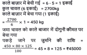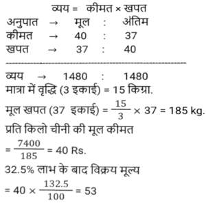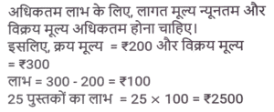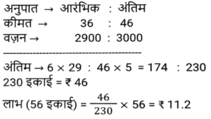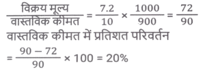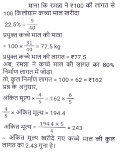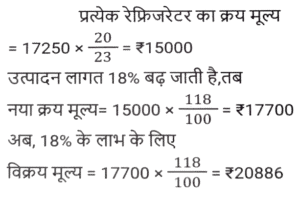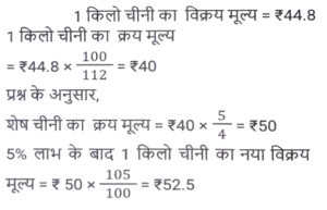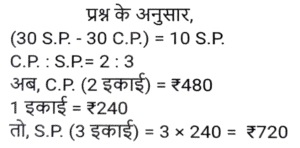 लाभ और हानि (SSC)Total Questions: 501. एक रेफ्रिजरेटर निर्माता प्रत्येक रेफ्रिजरेटर को ₹ 17,250 में बेचकर 15% का लाभ अर्जित करता है। यदि उत्पादन लागत 18% बढ़ जाती है, तो 18% का लाभ अर्जित करने के लिए रेफ्रिजरेटर का विक्रय मूल्य कितना होना चाहिए ? [SSC MTS 22/10/2024 (Morning)](a) ₹ 20,886(b) ₹ 34,086(c) ₹ 19,094(d) ₹21,032Correct Answer: (a) ₹ 20,886Solution:2. एक दुकानदार के 3 Kg के वजन (बांट) में 100 g कम है। उसने इसी गलत वजन (बांट) का उपयोग करके चारू को 3 Kg आलू ₹ 46 में बेच दिए। विक्रेता के लिए आलू का क्रय मूल्य ₹12 प्रति Kg था। उसने आलू पर कितना लाभ (₹ में) कमाया? [SSC CGL 26/09/2024 (3rd Shift)](a) 11.6(b) 10.2(c) 11.2(d) 10Correct Answer: (c) 11.2Solution:3. यदि ₹200 से ₹260 तक की कीमतों पर खरीदी गई पुस्तकों को ₹250 से ₹300 तक की कीमतों पर बेचा जाता है, तो 25 पुस्तकों को बेचने पर अधिकतम संभावित लाभ क्या होगा? [SSC CGL 26/09/2024 (1st Shift)](a) ₹2,300(b) ₹2,500(c) ₹1,800(d) ₹2,700Correct Answer: (b) ₹2,500Solution:4. एक विक्रेता ने ₹10 प्रति kg के हिसाब से सब्जियाँ बेचना शुरू किया, लेकिन इस दर पर खरीदार नहीं मिला। इसलिए उसने कीमत घटाकर ₹7.2 प्रति kg कर दी, लेकिन 1 kg के बजाय 900 g के दोषपूर्ण वजन का उपयोग किया। वास्तविक मूल्य में प्रतिशत परिवर्तन ज्ञात कीजिए। [SSC CGL 19/09/2024 (1st Shift)](a) 10%(b) 15%(c) 20%(d) 25%Correct Answer: (c) 20%Solution:5. एक विक्रेता ने एक ग्राहक को धोखा देकर एक Kg में 20 कुकीज के बजाय 19 कुकीज देकर ₹95 में बेच दीं। यदि विक्रेता ने ₹76 में कुकीज़ खरीदीं, तो लाभ (₹ में) क्या होगा? [SSC CGL 18/09/2024 (3rd Shift)](a) 28.2(b) 26.2(c) 22.8(d) 25.8Correct Answer: (c) 22.8Solution:विक्रेता के लिए 20 कुकीज़ का क्रय० मू० = ₹ 76 विक्रेता के लिए 1 कुकीज़ का क्रय० मू० = ₹ 3.8 विक्रेता के लिए 19 कुकीज़ का वि० मू० = ₹ 95 लाभ = 95 -76 = ₹19 कुल लाभ = 19 + 3.8 (शेष 1 कुकीज़ की कीमत) = ₹ 22.86. यदि एक दुकानदार चीनी को ₹44.8 प्रति kg की दर से बेचता है, तो वह 12% लाभ अर्जित करता है। पानी के रिसाव के कारण चीनी का 1/5 हिस्सा खराब हो जाता है। 5% लाभ प्राप्त करने के लिए शेष चीनी का प्रति किलोग्राम विक्रय मूल्य क्या होना चाहिए? [SSC CGL 17/09/2024 (1st Shift)](a) ₹49.5(b) ₹52.5(c) ₹48.5(d) ₹51.8Correct Answer: (b) ₹52.5Solution:7. 30 मीटर कपड़ा बेचकर एक दुकानदार 10 मीटर कपड़े के विक्रय मूल्य के बराबर लाभअर्जित करता है। 1 मीटर कपड़े का विक्रय मूल्य ज्ञात कीजिए, जब 1 मीटर कपड़े का क्रय मूल्य ₹480 है। [SSC CHSL 03/07/2024 (3rd Shift)](a) ₹520(b) ₹960(c) ₹720(d) ₹820Correct Answer: (c) ₹720Solution:8. किसी वस्तु के लागत मूल्य में 7.5% की कमी होने पर एक दुकानदार ₹7,400 की राशि से पहले की खरीदी जाने वाली वस्तु की तुलना में 15 kg अधिक वस्तु खरीद सकता है। वस्तु के कटौती से पूर्व के क्रय मूल्य पर 32.5% का लाभ प्राप्त करने के लिए, वस्तु को किस मूल्य (₹ में) प्रति kg पर बेचना होगा? [SSC CPO 28/06/2024 (1st Shift)](a) 54(b) 53(c) 52(d) 51Correct Answer: (b) 53Solution:9. रमन्ना ने एक उत्पाद के निर्माण के लिए एक निश्चित कीमत पर कच्चा माल खरीदा। हालांकि, कामगारों की कमी के कारण, 22.5% कच्चे माल का उपयोग नहीं किया जा सका और वह खराब हो गया। उपयोग किए गए कच्चे माल की लागत का 80% निर्माण लागत के रूप में जोड़ा गया था। यदि रमन्ना