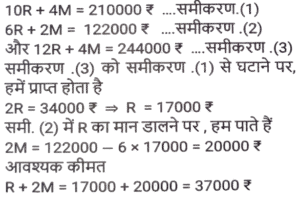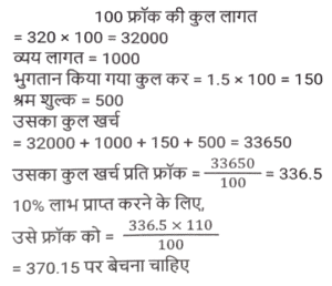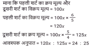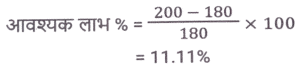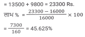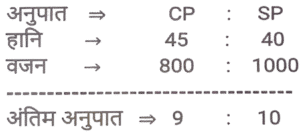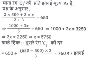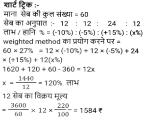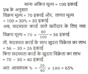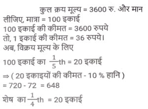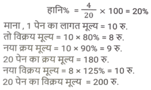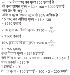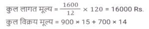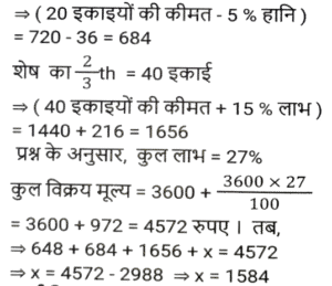 लाभ और हानि (SSC)Total Questions: 5021. रिनी ने दो रंगों 'C₁', और 'C₂' को 2:3 के अनुपात में मिलाया है। यदि रंग 'C₁', का मूल्य ₹500 प्रति इकाई है और वह दोनों रंगों के मिश्रण को ₹650 प्रति इकाई की दर से बेचती है जिस पर उसे न तो कोई लाभ होता है और न ही कोई हानि, तो दूसरे रंग, अर्थात् 'C₂' का प्रति इकाई मूल्य (₹ में) क्या है ? [SSC CGL 27/07/2023 (1st shift)](a) 750(b) 725(c) 760(d) 765Correct Answer: (a) 750Solution:22. एक दुकानदार ने ₹120 प्रति दर्जन की दर से 1600 आम खरीदे। इनमें से उसने 900 आम ₹15 प्रति आम और शेष आम ₹14 प्रति आम की दर से बेचे। उसका लाभ प्रतिशत है। [SSC CGL 25/07/2023 (4th shift)](a) 45.625%(b) 38.265%(c) 35.625%(d) 48.765%Correct Answer: (a) 45.625%Solution:23. एक दुकानदार ने Rs. 3,600 में एक निश्चित संख्या में सेब खरीदे। उसने उनमें से 1/5 भाग को 10% की हानि पर शेष के एक-चौथाई सेबों को 5% की हानि पर, और शेष के दो-तिहाई भाग को 15% के लाभ पर बेचा। कुल मिलाकर 27% का लाभ अर्जित करने के लिए उसे शेष सेबों को किस कीमत पर (Rs. में) बेचना चाहिए? [SSC CGL 25/07/2023 (1st shift)](a) 1,548(b) 1,584(c) 1,845(d) 1,864Correct Answer: (b) 1,584Solution:24. एक रिटेलर ₹92,000 अंकित मूल्य के एक एयर कंडीशनर को बेचने के लिए 30% की छूट की घोषणा करता है। एयर कंडीशनर का क्रय मूल्य अंकित मूल्य से 70% कम है। यदि खरीदार खुदरा विक्रेता के स्टोर का अपना सदस्यता कार्ड प्रस्तुत करता है तो वह 20% की अतिरिक्त छूट प्रदान करता है। सदस्यता कार्ड योजना के साथ खुदरा विक्रेता का लाभ सदस्यता कार्ड योजना के बिना खुदरा विक्रेता के लाभ का कितना प्रतिशत है? [SSC CGL 20/07/2023 (3rd shift)](a) 62%(b) 65%(c) 70%(d) 74%Correct Answer: (b) 65%Solution:25. अजय को 20 पेन बेचते समय एक दुकानदार को 4 पेन के क्रय मूल्य की हानि हो रही है। यदि दुकानदार ने 20 पेन 10% कम कीमत पर खरीदे होते और 20 पेन अजय को विक्रय मूल्य से 25% अधिक पर बेचे होते, तो उसे कितने प्रतिशत का लाभ होता (दशमलव के 1 स्थान तक पूर्णांकित) ? [Graduate Level 28/06/2023 (Shift-3)](a) 8.0(b) 11.1(c) 10.0(d) 12.5Correct Answer: (b) 11.1Solution:26. दस रेफ्रिजरेटर और चार मोबाइल फोन का कुल क्रय मूल्य ₹2,10,000 है, जबकि छः रेफ्रिजरेटर और दो मोबाइल फोन का कुल क्रय मूल्य ₹1,22,000 है। एक रेफ्रिजरेटर और दो मोबाइल फोन का क्रय मूल्य (₹ में) क्या होगा? [SSC CHSL Tier II (26/06/2023)](a) 37000(b) 35200(c) 34500(d) 36000Correct Answer: (a) 37000Solution:27. मुकेश दो शर्ट बेचता है। पहली शर्ट का क्रय मूल्य, दूसरी शर्ट के विक्रय मूल्य के बराबर है। पहली शर्ट को 20 प्रतिशत के लाभ पर बेचा जाता है और दूसरी शर्ट को 20 प्रतिशत की हानि पर बेचा जाता है। पहली शर्ट के विक्रय मूल्य और दूसरी शर्ट के क्रय मूल्य का अनुपात क्या है? [SSC MTS 19/06/2023 (Afternoon)](a) 18 : 25(b) 97 : 100(c) 24 : 25(d) 27 : 50Correct Answer: (c) 24 : 25Solution:28. कपिल ने ₹320 प्रति फ्रॉक के दर से 100 फ्रॉक्स खरीदे। परिवहन व्यय ₹1000 था। उसने प्रति फ्रॉक ₹1.50 का कर दिया और श्रम शुल्क ₹500 था। यदि वह 10% का लाभ कमाना चाहती है तो प्रति फ्रॉक विक्रय मूल्य कितना होना चाहिए? [SSC MTS 18/07/2022 (Morning)](a) ₹385.45(b) ₹370.15(c) ₹390.80(d) ₹336.50Correct Answer: (b) ₹370.15Solution:29. अक्षय के पास 30 वस्तुएँ हैं, प्रत्येक का क्रय मूल्य समान है। उसने प्रत्येक