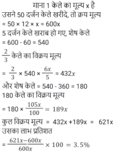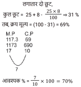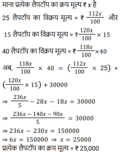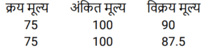 लाभ और हानिTotal Questions: 501. एक वस्तु को ₹1,920 में बेचने पर जेस द्वारा अर्जित प्रतिशत लाभ, उस वस्तु को ₹1,500 में बेचने पर हुई प्रतिशत हानि के बराबर है। यदि वह 10% लाभ अर्जित करना चाहता है, तो उसे उस वस्तु को किस विक्रय मूल्य पर बेचना चाहिए? [Group D 17/08/2022 (Afternoon)](a) ₹4,000 (b) ₹7,000 (c) ₹1,881(d) ₹2,000Correct Answer: (c) ₹1,881Solution:2. एक विक्रेता ने 25 लैपटॉप 12% के लाभ पर और 15 लैपटॉप 20% के लाभ पर बेचे। यदि उसने सभी 40 लैपटॉप 18% के लाभ पर बेचे होते, तो उसका लाभ ₹30,000 बढ़ जाता। यदि सभी 40 लैपटॉप का क्रय मूल्य समान है, तो प्रत्येक लैपटॉप का क्रय मूल्य ज्ञात कीजिए। [Group D 18/08/2022 (Afternoon)](a) ₹28,000 (b) ₹26,000 (c) ₹25,000(d) ₹27,000Correct Answer: (c) ₹25,000Solution:3. एक बेईमान दुकानदार चावल को ₹95 प्रति किग्रा के क्रय मूल्य पर बेचने का दावा करता है, लेकिन वह जिस बाट का उपयोग करता है, उस पर 1 किग्रा लिखा होता है, जबकि वास्तव में उसका वजन 950 ग्राम होता है। इस प्रकार उसे 100 किग्रा के वास्तविक वजन वाले चावल को बेचने पर होने वाला लाभ ज्ञात कीजिए। [Group D 29/08/2022 (Morning)](a) ₹500 (b) ₹275 (c) ₹475 (d) ₹375Correct Answer: (a) ₹500 Solution:4. एक बेईमान दुकानदार अपने सामान को लागत मूल्य पर बेचने का दिखावा करता है, लेकिन एक गलत वजन का उपयोग करता है, जिस पर 984 ग्राम लिखा होता है, लेकिन वास्तव में इसका वजन बहुत कम होता है। इस झूठे वजन का उपयोग करके दुकानदार को वास्तव में 23% का लाभ होता है। उपयोग किए गए वजन का वास्तविक मान ज्ञात कीजिए। [Group D 30/08/2022 (Morning)](a) 900 (b) 800(c) 850 (d) 935Correct Answer: (b) 800Solution:5. एक खुदरा विक्रेता अपने माल पर 25% की व्यापारिक छूट देने से पहले ही छूट वाले मूल्य पर 8% की नकद छूट देता है, और फिर भी क्रय मूल्य के 17.3% के बराबर शुद्ध लाभ अर्जित करता है। माल का अंकित मूल्य उसके क्रय मूल्य से कितने प्रतिशत अधिक रखा गया था? [Group D 02/09/2022 (Morning)](a) 50% (b) 60% (c) 75% (d) 70%Correct Answer: (d) 70%Solution:6. एक वस्तु को 28% के लाभ पर बेचा जाता है। यदि क्रय मूल्य में ₹50 की वृद्धि की जाती है और विक्रय मूल्य में ₹18 की कमी की जाती है, तो लाभ 11.6% हो जाता है। वस्तु का मूल क्रय मूल्य (₹ में) क्या है? [Group D 08/09/2022 (Morning)](a) 480 (b) 350 (c) 400 (d) 450Correct Answer: (d) 450Solution:7. किसी पुस्तक के अंकित मूल्य पर 10% की छूट देने पर एक पुस्तक विक्रेता को 20% का लाभ प्राप्त होता है। यदि छूट को बढ़ाकर 12.5% कर दिया जाता है, तो पुस्तक विक्रेता को कितने प्रतिशत लाभ प्राप्त होगा? [Group D 08/09/2022 (Afternoon)](a) 17⅔% (b) 18⅔% (c) 16⅔%(d) 15⅔%Correct Answer: (c) 16⅔%Solution:8. एक वस्तु का अंकित मूल्य ₹100 है। इस वस्तु को 25% की छूट पर बेचने से 25% लाभ प्राप्त होता है। यदि इसे अंकित मूल्य से ₹20 कम में बेचा जाए, तो इस पर प्राप्त प्रतिशत हानि या प्रतिशत लाभ (लगभग) ज्ञात कीजिए। [Group D 08/09/2022 (Evening)](a) 35% हानि (b) 25% लाभ (c) 12½% हानि (d) 33⅓% लाभCorrect Answer: (d) 33⅓% लाभSolution:9. एक व्यक्ति ने क्रमशः ₹2 में 3 सेब, और ₹1 प्रति सेब की दर से सेब की दो किस्में खरीदी। यदि उसने प्रत्येक किस्म के सेब समान संख्या में खरीदे और फिर सभी सेबों को ₹1 प्रति सेब की दर से बेचा, तो उ