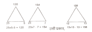 लुप्त संख्या (भाग-IV)Total Questions: 5031. हल कीजिए : [SSC CHSL 19/03/2020 (Morning)](a) 13(b) 11(c) 21(d) 23Correct Answer: (a) 13Solution:32. हल कीजिए : [SSC CHSL 19/03/2020 (Morning)](a) 22(b) 25(c) 12(d) 21Correct Answer: (c) 12Solution:कॉलम । में, (11 + 5 + 3)² = (19)² = 361 कॉलम ii में, (17 + 3 + 7)² = (27)² = 729 कॉलम iii में, (8 + 15 + 12)² = (35)² = 122533. हल कीजिए : [SSC CHSL 13/10/2020 (Evening)](a) 62(b) 22(c) 38(d) 58Correct Answer: (a) 62Solution:कॉलम (i) में 16 + 4 = 20 ⇒ 20/2 = 10 , कॉलम (ii) में, 30 + 34 = 64 ⇒ 64/2 = 32 कॉलम (iii) में, 18 + 62 = 80 ⇒ 80/2 = 4034. हल कीजिए : [SSC CHSL 14/10/2020 (Morning)](a) 3(b) 6(c) 4(d) 7Correct Answer: (c) 4Solution:तीसरे कॉलम की संख्या पहले दो कॉलम में संख्याओं के योग का वर्ग है। 6 + 4 = 10 ⇒ (10)² = 100 7 + 5 = 12 ⇒ (12)² = 144 9 + 4 = 13 ⇒ (13)² = 16935. हल कीजिए : [SSC CHSL 16/10/2020 (Morning)](a) 11(b) 5(c) 14(d) 16Correct Answer: (c) 14Solution:36. हल कीजिए : [SSC CHSL 16/10/2020 (Afternoon)](a) 737(b) 521(c) 729(d) 396Correct Answer: (a) 737Solution:131 = (5)³ + 6 = 125 + 6 348 = (7)³ + 5 = 343 + 5 ? = (9)³ + 8 = 729 + 8 = 73737. हल कीजिए : [SSC CHSL 20/10/2020 (Morning)](a) S(b) K(c) J(d) RCorrect Answer: (c) JSolution:एक दूसरे के लंबवत विपरीत अक्षरों की वर्णमाला संख्याओं का योग 19 है। A + R = 19 , G + L = 19 , उसी प्रकार, 1 + J = 1938. हल कीजिए : [SSC CHSL 20/10/2020 (Evening)](a) 11(b) 16(c) 12(d) 14Correct Answer: (a) 11Solution:दिया गया पैटर्न निम्नलिखित नियम का पालन करता है:- (4)² - (1)³ = 16 - 1 = 15 (7)² - (3)³ = 49 - 27 = 22 (?)² - (4)³ = 57 ⇒ (?)² - 64 = 57 उसी प्रकार, ⇒ (?)² = 57 + 64 = 121 ⇒ ? = √121 =1139. हल कीजिए : [SSC CHSL 21/10/2020 (Morning)](a) 264(b) 256(c) 260(d) 512Correct Answer: (c) 260Solution:यहाँ, पंक्तिवारः 10 × 2 = 20, 20 - 2(2 - 1) = 18 30 × 3 = 90, 90 - 3(3 - 1) = 84 4 × 68 = 272, 272 - 4(4 - 1) = 26040. हल कीजिए : [SSC CHSL 21/10/2020 (Morning)](a) 118(b) 144(c) 110(d) 120Correct Answer: (b) 144Solution:Submit Quiz« Previous12345Next »
