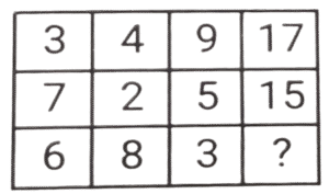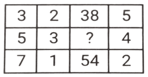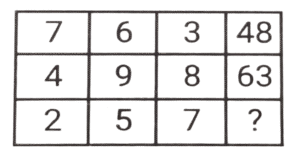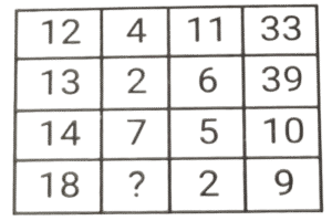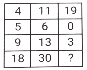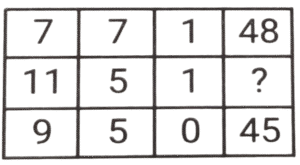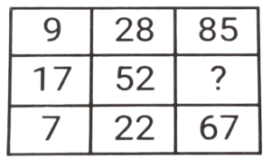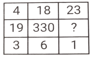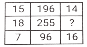 लुप्त संख्या (भाग-V)Total Questions: 6011. हल कीजिए : [SSC CPO 11/12/2019 (Morning)](a) 8(b) 5(c) 3(d) 4Correct Answer: (d) 4Solution:तर्क :- प्रत्येक पंक्ति में पहली संख्या/दूसरी संख्या = चौथी संख्या/तीसरी संख्या 18/? = 9/2 ⇒ ? = 4 = अतः लुप्त संख्या 4 है।12. हल कीजिए : [SSC CPO 11/12/2019 (Evening)](a) 350(b) 530(c) 529(d) 550Correct Answer: (b) 530Solution:पहली पंक्ति में, 4² + 3 = 16 + 3 = 19 दूसरी पंक्ति में, 18² + 6 = 324 + 6 = 330 ; इसलिए, तीसरी पंक्ति में, 23² + 1 = 529 + 1 = 53013. हल कीजिए : [SSC CPO 12/12/2019 (Morning)](a) 8(b) 12(c) 13(d) 15Correct Answer: (d) 15Solution:तर्क (पंक्ति में) :- दूसरी संख्या = (पहली संख्या × तीसरी संख्या) -तीसरी संख्या 255 = (18x) - x , x = 255/17 = 15 अतः लुप्त संख्या 15 है।14. हल कीजिए : [SSC CPO 12/12/2019 (Evening)](a) 2(b) 5(c) 4(d) 3Correct Answer: (a) 2Solution:तर्क :- प्रत्येक कॉलम में (पहली संख्या × तीसरी संख्या) + चौथी संख्या = दूसरी संख्या।, इसी तरह, तीसरे कॉलम में, (8 × ?) + 48 = 64 ⇒ ? = 16/8 = 215. हल कीजिए : [SSC CPO 13/12/2019 (Morning)](a) 48(b) 52(c) 40(d) 50Correct Answer: (d) 50Solution:पहली पंक्ति में, 3² + 2² + 5² = 9 + 4 + 25 = 38 तीसरी पंक्ति में, 7² + 1² + 2² = 49 + 1 + 4 = 54 इसी तरह, दूसरी पंक्ति में, 5² + 3² + 4² = 25 + 9 + 16 = 5016. हल कीजिए : [SSC CPO 13/12/2019 (Evening)](a) 157(b) 154(c) 150(d) 165Correct Answer: (a) 157Solution:तर्क :- प्रत्येक पंक्ति में 3n + 1 = m : 3m + 1 जैसे, 7, 7 × 3 + 1 = 22 , 22 × 3 + 1 = 67 इत्यादि। इसलिए, उत्तर 52, 52 × 3 + 1 = 157 है।17. हल कीजिए : [SSC MTS 02/08/2019 (Morning)](a) 28(b) 42(c) 52(d) 56Correct Answer: (b) 42Solution:7 + 6 + 3 = 16 × 3 = 48 4 + 9 + 8 = 21 × 3 = 63 2 + 5 + 7 = 14 × 3 = 4218. हल कीजिए : [SSC MTS 02/08/2019 (Afternoon)](a) 20(b) 25(c) 22(d) 18Correct Answer: (c) 22Solution:4 + 5 + 9 =18 11 + 6 + 13 = 30, 19 + 0 + 3 = 2219. हल कीजिए : [SSC MTS 05/08/2019 (Morning)](a) 36(b) 72(c) 48(d) 54Correct Answer: (d) 54Solution:7 × 7 - 1 = 48 ; 9 × 5 - 0 = 45, 11 × 5 - 1 = 55 - 1 = 54.20. हल कीजिए : [SSC MTS 05/08/2019 (Afternoon)](a) 18(b) 20(c) 16(d) 28Correct Answer: (a) 18Solution:3 + 4 + 9 = 16 + 1 = 17 7 + 2 + 5 = 14 + 1 = 15 6 + 8 + 3 = 17 + 1 = 18.Submit Quiz« Previous123456Next »