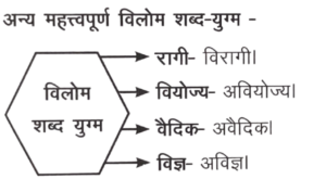 विलोम (Part-8)Total Questions: 5021. 'लघु' का विलोम है- [U.P. P. C. S. (Mains), 2020](a) गुरु(b) दीर्घ(c) (a) तथा (b)(d) इनमें से कोई नहींCorrect Answer: (c) (a) तथा (b)Solution:'लघु' के विलोम 'गुरु' और 'दीर्घ' दोनों होते हैं। वक्र के विलोम ऋजु तथा सरल दोनों होते हैं।22. लौकिक जगत् की माया में सभी फंसे हुए हैं। रेखांकित शब्द का सटीक विलोम बताइए। [UPSSSC युवा कल्याण एवं विकास दल अधिकारी परीक्षा, 2018 (II)](a) अलौकिक(b) कुटिल(c) सांसारिक(d) दुनियावीCorrect Answer: (a) अलौकिकSolution:रेखांकित शब्द 'लौकिक' का विलोम 'अलौकिक' है। कुटिल का विलोम सरल और सांसारिक का विलोम पारलौकिक होता है।23. 'विषाद' का विलोम क्या होगा? [UPPCL एक्जीक्यूटिव असि. परीक्षा, 2022](a) हर्ष(b) प्रमाद(c) शोक(d) अवसादCorrect Answer: (a) हर्षSolution:'विषाद' का विलोम 'हर्ष' होता है।24. 'विस्तीर्ण' निम्न में से किस शब्द का विलोम है? [उत्तराखण्ड असि. एकाउण्टेंट, परीक्षा-2023](a) प्रकीर्ण(b) संकीर्ण(c) प्रवीण(d) इनमें से कोई नहींCorrect Answer: (b) संकीर्णSolution:'विस्तीर्ण' का विलोम संकीर्ण होता है। विस्तीर्ण का अर्थ है 'फैला हुआ' तथा संकीर्ण का अर्थ है 'संकुचित'।25. 'वक्ता' शब्द का विलोम है- [UPSSSC कनिष्ठ सहायक (द्वितीय पाली) परीक्षा 2019](a) आयोजक(b) प्रयोजक(c) श्रोता(d) व्याख्याताCorrect Answer: (c) श्रोताSolution:'वक्ता' शब्द का विलोम 'श्रोता' होता है।26. 'व्यास' का विलोम शब्द है- [UPSSSC (JE) Exam, 2016](a) समास(b) संश्लेषण(c) संक्षेप(d) लघुCorrect Answer: (a) समासSolution:व्यास शब्द का विलोम 'समास' होता है। संश्लेषण का विश्लेषण, लघु का दीर्घ तथा संक्षेप का विलोम विस्तार होता है।27. 'विमुख' का विलोम शब्द हैः [MPSI (SI) Exam, 29th oct 2017 (09:00 AM)](a) उन्मुख(b) मुख(c) समुख(d) मुखयुक्तCorrect Answer: (a) उन्मुखSolution:'विमुख' शब्द का विलोम उन्मुख और सम्मुख होता है।28. 'वृद्धि' का विलोम शब्द है- [बिहार पुलिस कांस्टेबिल परीक्षा, 2017](a) अतिवृद्धि(b) अवृद्धि(c) कमवृद्धि(d) क्षयCorrect Answer: (d) क्षयSolution:'वृद्धि' शब्द का विलोम शब्द 'क्षय' है। 'क्षय' का विलोम अक्षय होता है। कमवृद्धि का अधिक वृद्धि, अतिवृद्धि का, विलोम अल्पवृद्धि होता है।29. 'विघ्न' का विलोम है- [U.P. P. C. S. (Mains), 2020](a) बाधा(b) स्थिर(c) निर्विघ्न(d) सर्वत्रCorrect Answer: (c) निर्विघ्नSolution:'विघ्न' का विलोम 'निर्विघ्न' होता है। 'स्थिर' का 'अस्थिर होता है। सर्वत्र का विलोम कहीं-कहीं होता है। बाधा का विलोम अबाधा तथा बाधक का विलोम अबाधक होता है।30. दिए गए विकल्पों में से 'विकीर्ण' शब्द का विपरीतार्थी शब्द कौन-सा है? [UPSI Exam, 14-दिसम्बर, 2017 (प्रथम पाली)](a) विस्तार(b) भीतर(c) वितरण(d) एकत्रCorrect Answer: (d) एकत्रSolution:'विकीर्ण' शब्द का विपरीतार्थी 'एकत्र' है। 'बाहर' का विपरीतार्थी शब्द भीतर/अन्दर है।Submit Quiz« Previous12345Next »