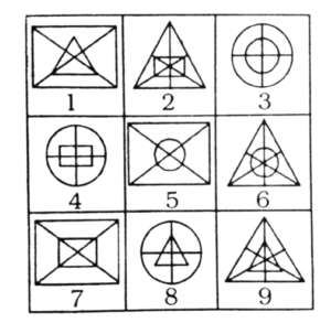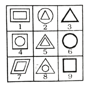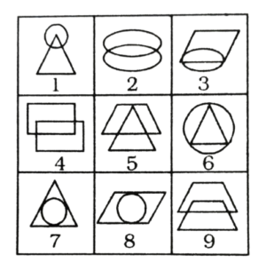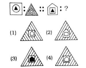 विविध : सादृश्यता या समसंबंध (101-130 प्रश्न)Total Questions: 3011. वह आकृति ढूंढें, जो निम्नलिखित समरूपता में प्रश्न चिह्न को प्रतिस्थापित करेगा। [RRB Group 'D' CBT परीक्षा, 14.12.2018 द्वितीय पाली](1)(2)(3)(4)Correct Answer: (4)Solution:दी गई आकृति में विकल्प (4) प्रश्न चिह्न को प्रतिस्थापित करेगा।12. निम्नलिखित सादृश्य में प्रश्न चिह्न (?) को कौन सी आकृति प्रतिस्थापित करेगी। [RRB Group 'D' CBT परीक्षा, 17.12.2018 प्रथम पाली](1)(2)(3)(4)Correct Answer: (2)Solution:विकल्प प्रश्न आकृति को प्रतिस्थापित करेगा।13. कौन-सा पैटर्न निम्न में से किसके साथ सबसे नजदीकी दिखाता है? [RRB Group 'D' CBT परीक्षा, 17.12.2018 द्वितीय पाली](1) C(2) B(3) D(4) ACorrect Answer: (2) BSolution:B चित्र प्रश्न के पैटर्न से साम्यता रखता है।14. कौन-सा पैटर्न निम्न में से किसके साथ सबसे नजदीकी दिखाता है? [RRB Group 'D' CBT परीक्षा, 17.12.2018 (द्वितीय पाली](1) B(2) A(3) C(4) DCorrect Answer: (3) CSolution:C विकल्प का पैटर्न उक्त चित्र से सबसे नजदीकी दिखाता है।15. समस्या चित्र के श्रेणी को उत्तर चित्र में से किसी एक उपयुक्त चित्र का चयन कर पूरा करें- [RRB ALP एवं Technician परीक्षा, 09.08.2018 तृतीय पाली](1) A(2) D(3) B(4) CCorrect Answer: (1) ASolution:प्रत्येक चित्र का अगला चित्र विपरीत है। अतः उत्तर आकृति होगा।16. यदि दी गई आकृतियों में से प्रत्येक का केवल एक बार प्रयोग कर तीन समूह बन सकते हैं तो वह समूह _______ होंगे। [RRB ALP एवं Technician परीक्षा, 09.08.2018 तृतीय पाली](1) (1, 5, 8), (2, 4, 7) और (3, 6, 9)(2) (1, 5, 7), (2, 4, 9) और (3, 6, 8)(3) (1, 5, 7), (2, 6, 8) और (3, 4, 9)(4) (1, 5, 7), (2, 4, 8) और (3, 6, 9)Correct Answer: (4) (1, 5, 7), (2, 4, 8) और (3, 6, 9)Solution:एक बार प्रयोग करने पर तीन समूह (1, 5, 7), (2, 4, 8) और (3, 6, 9)17. नीचे दिए गए आंकड़ों में से प्रत्येक का उपयोग केवल एक बार करें और तीन समूह बनाएं। तीन समूहों का गठन इस प्रकार है: [RRB ALP एवं Technician परीक्षा, 10.08.2018 प्रथम पाली](1) (1, 5, 9), (2, 3, 6), (4, 7,8)(2) (1, 3, 8), (2, 5, 6), (4, 7, 9)(3) (1, 3, 9), (2, 5, 6), (4, 7, 8)(4) (1, 3, 6), (2, 5, 9), (4, 7, 8)Correct Answer: (3) (1, 3, 9), (2, 5, 6), (4, 7, 8)Solution:प्रत्येक आकृति को एक बार प्रयोग करने पर बनने वाले तीन समूह (1, 3, 9), (2, 5, 6), (4, 7, 8) हैं।18. नीचे दी गई प्रत्येक आकृति का केवल एक बार प्रयोग करके तीन समूह बनाइए। इस तरह से बनने वाले तीन समूह हैं- [RRB ALP एवं Technician परीक्षा, 10.08.2018 तृतीय पाली](1) (1, 5, 7), (2, 3, 9), (4, 6, 8)(2) (1, 5, 7), (2, 6, 9), (4, 3, 8)(3) (1, 5, 7), (2, 6, 8), (4, 3, 9)(4) (1, 5, 9), (2, 6, 7), (4, 3, 8)Correct Answer: (2) (1, 5, 7), (2, 6, 9), (4, 3, 8)Solution:प्रत्येक आकृति का प्रयोग करके तीन .समूह = (1, 5, 7), (2, 6, 9), (4, 3, 8)19. चित्र के दिए गए संबंधित जोड़े के आधार पर अनुपस्थित चित्र चुनें। [RRB ALP एवं Technician परीक्षा, 10.08.2018 तृतीय पाली](1)(2)(3)(4)Correct Answer: (1)Solution:जिस प्रकार फल का संबंध जूस से है उसी प्रकार भेड़ का संबंध ऊन से है।20. नीचे दी गई प्रत्येक आकृति का केवल एक बार प्रयोग करके तीन समूह बनाइए। इस तरह से बनने वाले तीन समूह हैं- [RRB ALP एवं Technician परीक्षा, 13.08.2018 प्रथम पाली](1) (1, 3, 5), (2, 7, 9), (6, 4, 8)(2) (1, 3, 5), (2, 4, 8), (6, 7, 9)(3) (1, 3, 5), (6, 4, 9), (2, 7, 8)(4) (1, 3, 5), (2, 4, 9), (6, 7, 8)Correct Answer: (4) (1, 3, 5), (2, 4, 9), (6, 7, 8)Solution:एक बार प्रयोग कर तीन समूह = (1, 3, 5), (2, 4, 9), (6, 7, 8)Submit Quiz« Previous123Next »