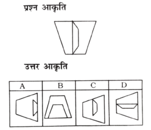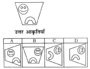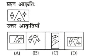 विविध : सादृश्यता या समसंबंध (1-50 प्रश्न)Total Questions: 5041. उत्तर आकृति का कौन-सा चित्र प्रश्न आकृति में दी गयी दोनों आकृतियों के मेल से बना है? [RRB Group 'D' CBT परीक्षा 17.09.2018 प्रथम पाली](1)(2)(3)(4)Correct Answer: (2)Solution:उत्तर आकृति (2), प्रश्न आकृति में दिए गए दोनों आकृतियों के मेल से बना है।42. विकल्पों में कौन-सा निम्न पैटर्न की भाँति प्रतीत होता है? [[RRB Group 'D' CBT परीक्षा, 17.09.2018 प्रथम पाली](1)(2)(3)(4)Correct Answer: (1)Solution:स्पष्टतः, उत्तर आकृति (1) प्रश्न आकृति की भाँति प्रतीत होता है।43. कौन-सा विकल्प चित्र प्रश्न चित्र के साथ निकटतम समानता रखता है? [RRB Group 'D' CBT परीक्षा, 18.09.2018 प्रथम पाली](1) A(2) B(3) D(4) CCorrect Answer: (3) DSolution:प्रश्न चित्र से समानता वाला विकल्प 'D' है।44. कौन-सा विकल्प चित्र निम्न प्रश्न चित्र के साथ निकटतम समानता रखता है? [RRB Group 'D' CBT परीक्षा, 18.09.2018 तृतीय पाली](1) C(2) A(3) B(4) DCorrect Answer: (1) CSolution:प्रश्न चित्र को 90° घुमाने पर विकल्प चित्र 'C' के समान होगा।45. निम्नलिखित में से कौन-सा पैटर्न नीचे दिए गए चित्र के पैटर्न की तरह दिखता है? [RRB Group 'D' CBT परीक्षा, 19.09.2018 प्रथम पाली](1) A(2) D(3) C(4) BCorrect Answer: (3) CSolution:प्रश्न में दिए गए आकृति उत्तर आकृति के विकल्प C के समरूप पैटर्न पर आधारित है।46. विकल्पों में से कौन दिए गए चित्र का निकटस्थ सदृश्य है? [RRB Group 'D' CBT परीक्षा, 20.09.2018 प्रथम पाली](1) B(2) D(3) C(4) ACorrect Answer: (1) BSolution:दिए गए चित्र का निकटस्थ सदृश चित्र विकल्प 'B' है।47. निम्नलिखित में से कौन-सी विकल्प आकृति प्रश्न आकृति से निकटतम समानता दर्शाती है? [RRB Group 'D' CBT परीक्षा, 20.09.2018 प्रथम पाली](1) A(2) B(3) D(4) CCorrect Answer: (3) DSolution:प्रश्न आकृति का निकटतम समानता 15 विकल्प आकृति 'D' है।48. विकल्पों में से कौन दिए गए चित्र का निकटस्थ सदृश्य है? [RRB Group 'D' CBT परीक्षा, 20.09.2018 प्रथम पाली](1) B(2) C(3) D(4) ACorrect Answer: (2) CSolution:दी गई आकृति को 90° घड़ी की दिशा में घुमाने पर विकल्प 'C' जैसा दिखेगा।49. निम्नलिखित विकल्पों में से कौन-सा पैटर्न दी गई आकृति के पैटर्न के समान दिखता है? [RRB Group 'D' CBT परीक्षा, 22.09.2018 द्वितीय पाली](1) A(2) B(3) D(4) CCorrect Answer: (2) BSolution:दी गई आकृति उत्तर आकृति 'B' के समान दिखाई देती है।50. निम्नलिखित विकल्पों में से कौन-सा पैटर्न दी गई आकृति के पैटर्न के समान दिखता है? [RRB Group 'D' CBT परीक्षा, 22.09.2018 द्वितीय पाली](1) A(2) B(3) C(4) DCorrect Answer: (2) BSolution:दिए गए आकृति के समान आकृति - B दिखाई देता है।Submit Quiz« Previous12345