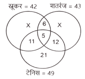 Solution:वेन आरेख के अनुसार, केवल टेनिस खेलने वाले विद्यार्थियों की संख्या = 49 - (11 + 5 + 12) = 21