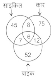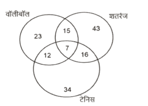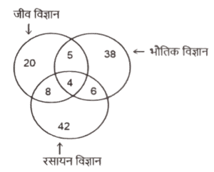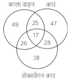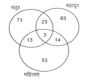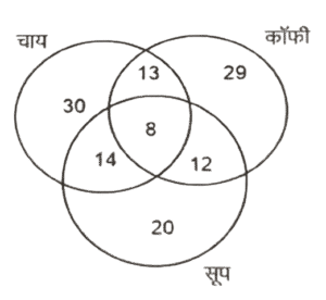 वेन आरेख (भाग-I)Total Questions: 5021. दिए गए वेन आरेख के अनुसार कितने लोग या तो केवल कार या केवल फॉक्सवैगन वाहन पसंद करते हैं? [SSC CGL 12/09/2024 (3rd Shift)](a) 85(b) 66(c) 28(d) 75Correct Answer: (a) 85Solution:या तो केवल कारें या केवल वोक्सवैगन पसंद करने वाले लोगों की संख्या = 47 + 38 = 8522. दिए गए वेन आरेख का अध्ययन करें और नीचे दिए गए प्रश्न का उत्तर दें। [SSC CGL 13/09/2024 (3rd Shift)]कितनी महिलाएं या तो चतुर है या बहादुर हैं या दोनों हैं ?(a) 27(b) 23(c) 30(d) 26Correct Answer: (c) 30Solution:महिलाएं या तो चतुर या बहादुर या दोनों हैं = 13 + 14 + 3 = 3023. दिए गए वेन आरेख के अनुसार ऐसे कितने लोग हैं जो या तो केवल वॉलीबॉल या केवल शतरंज खेलते हैं ? [SSC CGL 13/09/2024 (3rd Shift)](a) 81(b) 88(c) 15(d) 66Correct Answer: (d) 66Solution:जो लोग या तो केवल वॉलीबॉल या केवल शतरंज खेलते हैं 23 + 43 = 6624. दिए गए आरेख का ध्यानपूर्वक अध्ययन कीजिए और नीचे दिए गए प्रश्न का उत्तर दीजिए। विभिन्न वर्गों वाली संख्याएँ उन छात्रों की संख्या दर्शाती हैं जो विशेष विषयों को पसंद करते हैं। [SSC CGL 19/09/2024 (3rd Shift)]कितने छात्र हिंदी और विज्ञान दोनों पसंद करते हैं, लेकिन गणित को पसंद नहीं करते?(a) 12(b) 11(c) 4(d) 10Correct Answer: (c) 4Solution:हिंदी और विज्ञान दोनों पसंद करने वाले लेकिन गणित पसंद नहीं करने वाले छात्रों की संख्या = 425. नीचे दिया गया वेन आरेख चाय (Tea), कॉफी (Coffee) और सूप (Soup) के लिए लोगों की पसंद को दर्शाता है। [SSC CGL 23/09/2024 (3rd Shift)](a) 43(b) 29(c) 21(d) 13Correct Answer: (c) 21Solution:चाय और कॉफ़ी दोनों पसंद करने वाले व्यक्तियों की संख्या = 13 + 8 = 2126. दिए गए वेन आरेख के अनुसार कितने लोग या तो केवल मसाले दार या केवल मीठा पसंद करते हैं ? [SSC CGL 23/09/2024 (3rd Shift)](a) 110(b) 120(c) 135(d) 144Correct Answer: (b) 120Solution:केवल मसाले दार या केवल मीठा पसंद करने वाले लोगों की संख्या = 65 + 55 = 12027. दिए गए आरेख का ध्यानपूर्वक अध्ययन करें और निम्नलिखित प्रश्न का उत्तर दें। विभिन्न खंडों में दी गई संख्याएं अलग-अलग वाहन चला सकने वाले व्यक्तियों की संख्या को दर्शाती हैं। [SSC CGL 24/09/2024 (3rd Shift)]सभी तीनों वाहन चला सकने वाले व्यक्तियों की संख्या और इन में से कोई भी दो वाहन चला सकने वाले व्यक्तियों की संख्या के बीच का अंतर क्या है?(a) 27(b) 15(c) 12(d) 21Correct Answer: (d) 21Solution:व्यक्ति जो तीनों वाहन चला सकता है = 6 व्यक्ति जो इनमें से किन्हीं दो वाहनों को चला सकता है = 12 + 8 + 7 = 27 आवश्यक अंतर = 27 - 6 = 2128. दिए गए आरेख का ध्यानपूर्वक अध्ययन करें और निम्नलिखित प्रश्न का उत्तर दें। विभिन्न खंडों में दी गई संख्याएं अलग-अलग विषयों का अध्ययन करना पसंद करने वाले छात्रों की संख्या को दर्शाती हैं। [SSC CGL 25/09/2024 (3rd Shift)]सभी तीनों विषयों का अध्ययन करना पसंद करने वाले छात्रों की संख्या और केवल जीव विज्ञान का अध्ययन करना पसंद करने वाले छात्रों की संख्या के बीच का अंतर क्या है?(a) 16(b) 3(c) 19(d) 17Correct Answer: (a) 16Solution:उन छात्रों की संख्या जो तीनों विषयों का अध्ययन करना पसंद करते हैं = 4 केवल जीव विज्ञान पढ़ना पसंद करने वाले छात्रों की संख्या = 20 आवश्यक अ