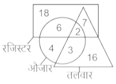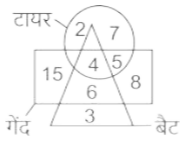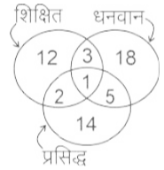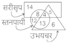 वेन आरेख (भाग-II)Total Questions: 5031. दिए गए आरेख में, कितने सरीसृप न तो स्तनपायी हैं और न ही उभयचर हैं ? [SSC CHSL 09/03/2023 (2nd Shift)](a) 14(b) 13(c) 12(d) 9Correct Answer: (a) 14Solution:सरीसृप जो न तो स्तनपायी हैं और नही उभयचर = 1432. दिए गए आरेख में, बसों की कुल संख्या कितनी है? [SSC CHSL 09/03/2023 (3rd Shift)](a) 13(b) 14(c) 15(d) 7Correct Answer: (c) 15Solution:वेन आरेख से हम कह सकते हैं कि बसों की कुल संख्या (6 + 4 + 3 + 2) =15 है।33. दिए गए आरेख में, कितनी पेन हैं ? [SSC CHSL 09/03/2023 (4th Shift)](a) 21(b) 16(c) 20(d) 25Correct Answer: (d) 25Solution:पेन की कुल संख्या = 12 + 4 + 9 = 2534. कितने काँच, फोन और कलम दोनों हैं ? [SSC CHSL 10/03/2023 (1st Shift)](a) 13(b) 24(c) 11(d) 15Correct Answer: (c) 11Solution:वेन आरेख से हम कह सकते हैं कि ऐसे कांच की संख्या जो फोन और कलम दोनों हैं = 11.35. दिए गए आरेख का ध्यानपूर्वक अध्ययन कीजिए और प्रश्नों के उत्तर दीजिए। विभिन्न खंडों की संख्या व्यक्तियों की संख्या दर्शाती है। [SSC CHSL 10/03/2023 (2nd Shift)]कितने लोग शिक्षित और धनवान हैं लेकिन प्रसिद्ध नहीं हैं ?(a) 2(b) 5(c) 3(d) 1Correct Answer: (c) 3Solution:लोग जो शिक्षित और धनवान हैं लेकिन प्रसिद्ध नहीं हैं = 336. दिए गए आरेख में, काली मेज़ कितनी हैं ? [SSC CHSL 10 /03/2023 (3rd Shift)](a) 9(b) 8(c) 7(d) 14Correct Answer: (d) 14Solution:वेन आरेख को देखकर हम कह सकते हैं कि काली मेजों की संख्या = 5 + 4 + 2 + 3 = 1437. माता, पति और पुरुष [SSC CHSL 10/03/2023 (4th Shift)](a)(b)(c)(d)Correct Answer: (c)Solution:38. दिए गए आरेख में, कितनी गेंदें न तो बैट है और न ही टायर हैं ? [SSC CHSL 13/03/2023 (3rd Shift)](a) 5(b) 7(c) 4(d) 3Correct Answer: (c) 4Solution:वेन आरेख से हम कह सकते हैं कि गेंदों की संख्या जो न तो बैट है और न ही टायर = 15 + 8 = 2339. कितने रजिस्टर न तो औज़ार हैं और न ही तलवार हैं ? [SSC CHSL 13/03/2023 (4th Shift)](a) 24(b) 18(c) 15(d) 25Correct Answer: (b) 18Solution:रजिस्टर जो न तो औज़ार हैं और न ही तलवार हैं = 1840. भारतीय, मस्तिष्क विशेषज्ञ, सर्जन [SSC CHSL 14/03/2023 (2nd Shift)](a)(b)(c)(d)Correct Answer: (c)Solution:Submit Quiz« Previous12345Next »