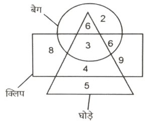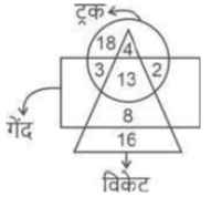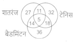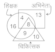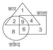 वेन आरेख (भाग-III)Total Questions: 501. दिए गए आरेख में, कुल शिक्षकों की संख्या कितनी है ? [SSC CHSL 16/03/2023 (4th Shift)](a) 17(b) 12(c) 20(d) 37Correct Answer: (d) 37Solution:कुल शिक्षकों की संख्या = 16 + 4 + 8 + 9 = 372. पिता, शिक्षक(teacher), पुरुष [SSC CHSL 17/03/2023 (1st Shift)](a)(b)(c)(d)Correct Answer: (d)Solution:3. दिए गए आरेख का ध्यानपूर्वक अध्ययन कीजिए और प्रश्नों के उत्तर दीजिए। विभिन्न खंडों में अलग-अलग खेल खेलने वाले छात्रों की संख्याओं को दर्शाया गया है। [SSC CHSL 17`/03/2023 (2nd Shift)](a) 32(b) 37(c) 61(d) 53Correct Answer: (d) 53Solution:छात्र जो केवल एक खेल खेलते हैं = 19 +13 + 21 = 534. कितने टैबलेट केवल कार हैं? [SSC CHSL 17/03/2023 (3rd Shift)](a) 4(b) 12(c) 8(d) 17Correct Answer: (c) 8Solution:सही उत्तर 8 है।5. दिए गए आरेख में, कितने काले केवल सफ़ेद हैं? [SSC CHSL 17/03/2023 (4th Shift)](a) 3(b) 9(c) 6(d) 15Correct Answer: (c) 6Solution:काले जो केवल सफ़ेद हैं = 66. विकेटों की कुल संख्या कितनी है ? [SSC CHSL 20/03/2023 (1st Shift)](a) 41(b) 21(c) 22(d) 17Correct Answer: (a) 41Solution:विकेटों की कुल संख्या = 4 + 13 + 8 + 16 = 417. कमल, लिली और आम [SSC CHSL 20/03/2023 (2nd Shift)](a)(b)(c)(d)Correct Answer: (c)Solution:8. कुल कितने लोग केवल दो खेलों में अच्छे हैं ? [SSC CHSL 20/03/2023 (4th Shift)](a) 43(b) 38(c) 48(d) 11Correct Answer: (a) 43Solution:केवल दो खेलों में अच्छे लोगों की कुल संख्या = 11 + 14 +18 = 439. कितने घोड़े न तो क्लिप हैं और न ही बैग हैं ? [SSC CHSL 21/03/2023 (1st Shift)](a) 9(b) 7(c) 5(d) 4Correct Answer: (c) 5Solution:घोड़ों की कुल संख्या जो न तो क्लिप और न ही बैग हैं, 5 हैं।10. इंजीनियर, वकील और विवाहित लोग [SSC CHSL 21/03/2023 (2nd Shift)](a)(b)(c)(d)Correct Answer: (c)Solution:Submit Quiz12345Next »