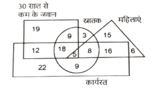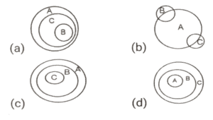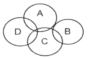 वेन आरेख (भाग-V)Total Questions: 191. निम्नलिखित चित्र के आधार पर पूछे गए प्रश्न का उत्तर दीजिए। [SSC CHSL 14/10/2020 (Evening)](a) 4(b) 7(c) 21(d) 11Correct Answer: (d) 11Solution:आरेख से यह स्पष्ट है कि (7 + 4 = 11), 11 विद्यार्थी भूगोल और गणित पसंद करते हैं लेकिन इतिहास नहीं।2. फल, खाने योग्य, कुकीज़ [SSC CHSL 15/10/2020 (Morning)](a)(b)(c)(d)Correct Answer: (d)Solution:3. सर्वभक्षी, भालू , मवेशी [SSC CHSL 15/10/2020 (Afternoon)](a)(b)(c)(d)Correct Answer: (b)Solution:भालू एक सर्वाहारी है जबकि मवेशी एक शाकाहारी जानवर है। 4. स्नातक, स्नातकोत्तर, बहनें [SSC CHSL 15/10/2020 (Evening)](a)(b)(c)(d)Correct Answer: (a)Solution:5. दिए गए वेंन आरेख में विभिन्न क्षेत्र विभिन्न खिलाडियों को दर्शाता है। A 'टेनिस खिलाड़ी' को, B 'बैडमिंटन खिलाड़ी' को , C 'हॉकी खिलाड़ी' को और D 'फुटबॉल खिलाड़ी' को दर्शाता है। [SSC CHSL 16/10/2020 (Afternoon)]निम्नलिखित में से कौन सा अक्षर सभी खिलाडियों को दर्शाता है ?(a) A(b) C(c) B(d) DCorrect Answer: (b) CSolution:C सभी प्रकार के खेल खिलाड़ी का प्रतिनिधित्व करता है।6. दी गयी आकृति को ध्यान पूर्वक पढ़ें और प्रश्न का उत्तर दें। [SSC CHSL 20/10/2020 (Morning)]कितने खिलाडी तीन में से कोई दो खेल खेलते हैं ?(a) 11(b) 9(c) 15(d) 13Correct Answer: (a) 11Solution:तीन में से दो खेल खेलने वाले विद्यार्थियों की संख्या = 6 + 5 = 117. भौतिकी, विज्ञान, जीव विज्ञान, प्राणीशास्त्र [SSC CHSL 20/10/2020 (Afternoon)](a)(b)(c)(d)Correct Answer: (b)Solution:8. दिरहम, यूएसडी (USD), मुद्रा [SSC CHSL 21/10/2020 (Afternoon)](a)(b)(c)(d)Correct Answer: (d)Solution:दिरहम और यूएसडी दोनों विभिन्न प्रकार की मुद्राएं हैं। 9. (A) चतुर्भुज, (B) आयत, (C) वर्ग [SSC CHSL 21/10/2020 (Evening)](a)(b)(c)(d)Correct Answer: (c)Solution:10. दिए गए वेन आरेख में त्रिकोण महिलाओं को, वृत्त स्नातकों को, आयत कार्यरत को और वर्ग 30 साल से कम के जवानों को दर्शाता है। दी गयी आकृति में अंक उस वर्ग में कितने व्यक्ति है को दर्शाता है। [SSC CHSL 26/10/2020 (Afternoon)]कितनी ऐसी स्नातक महिलाएं है जो 30 वर्ष से कम है और जिनके पास रोजगार है ?(a) 7(b) 12(c) 9(d) 5Correct Answer: (d) 5Solution:क्योंकि, त्रिकोण महिलाओं को, वृत्त स्नातकों को,और वर्ग 30 वर्ष से कम के जवानों को दर्शाता है और संख्या 5 ही एकमात्र संख्या है जो उपरोक्त सभी आंकड़ों में उपस्थित है। अतः , 5 सही उत्तर होगा। Submit Quiz12Next »