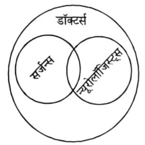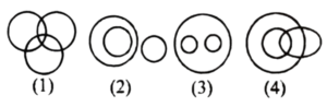 वेन आरेख Type-I (1-50 प्रश्न)Total Questions: 501. समचतुर्भज, चतुर्भुज, बहुभुज: [आरआरबी मुम्बई सहायक स्टेशन मास्टर परीक्षा 06.06.1999]निम्नलिखित में से प्रत्येक प्रश्न में 3 मदें दी गयी हैं। इन मदों के बीच संबंध बताते हुए प्रत्येक प्रश्न का सर्वोत्तम चित्र के साथ समानता दर्शाइये। आपका उत्तर उस चित्र को प्रदर्शित करने वाली संख्या होगा।(1) 1(2) 2(3) 3(4) 4Correct Answer: (3) 3Solution:सभी समचतुर्भुज चतुर्भुज के तथा सभी चतुर्भुज बहुभुज के अंतर्गत आते हैं। अतः इनके संबंधों को चित्र '3' द्वारा ही सर्वोत्तम ढंग से प्रदर्शित किया जा सकता है।2. पुष्प, वस्त्र, श्वेत: [आरआरबी मुम्बई सहायक स्टेशन मास्टर परीक्षा 06.06.1999]निम्नलिखित में से प्रत्येक प्रश्न में 3 मदें दी गयी हैं। इन मदों के बीच संबंध बताते हुए प्रत्येक प्रश्न का सर्वोत्तम चित्र के साथ समानता दर्शाइये। आपका उत्तर उस चित्र को प्रदर्शित करने वाली संख्या होगा।(1) 1(2) 2(3) 3(4) 4Correct Answer: (1) 1Solution:कुछ 'पुष्प' 'श्वेत' और कुछ 'श्वेत' 'वस्त्र' हो सकते हैं, किन्तु न तो कोई 'पुष्प' 'वस्त्र' हो सकता है और न कोई वस्त्र पुष्प हो सकता है। अतः इनके आपसी संबंधों को चित्र (1) द्वारा सर्वोत्तम ढंग से दर्शाया जा सकता है।3. टेनिस, क्रिकेट खिलाड़ी, विद्यार्थी: [आरआरबी मुम्बई सहायक स्टेशन मास्टर परीक्षा 06.06.1999]निम्नलिखित में से प्रत्येक प्रश्न में 3 मदें दी गयी हैं। इन मदों के बीच संबंध बताते हुए प्रत्येक प्रश्न का सर्वोत्तम चित्र के साथ समानता दर्शाइये। आपका उत्तर उस चित्र को प्रदर्शित करने वाली संख्या होगा।(1) 1(2) 2(3) 3(4) 4Correct Answer: (2) 2Solution:कुछ क्रिकेट खिलाड़ी टेनिस खेल सकते हैं तथा कुछ विद्यार्थी क्रिकेट खिलाड़ी हो सकते हैं; साथ ही कुछ विद्यार्थी जो क्रिकेट खिलाड़ी हों टेनिस भी खेल सकते हैं। इनके संबंधों को चित्र '2' के माध्यम से सर्वोत्तम रूप में प्रदर्शित किया जा सकता है।4. स्त्रियाँ, माताएँ, विधवाएँ : [आरआरबी त्रिवेन्द्रम सहायक स्टेशन मास्टर परीक्षा 06.02.2000]निम्नांकित प्रश्नों में तीन वर्ग दिए गए हैं। इन चार चित्रों में (1, 2, 3, 4,) से आपको सूचित करना है कि कौन-सा चित्र उन तीन वर्गों के संबंध को स्पष्ट प्रस्तुत करेगा?(1)(2)(3)(4)Correct Answer: (3)Solution:माताएँ एवं विधवाएँ दोनों ही स्त्रियाँ हैं।5. लेखक, अध्यापक, आदमी : [आरआरबी त्रिवेन्द्रम सहायक स्टेशन मास्टर परीक्षा 06.02.2000]निम्नांकित प्रश्नों में तीन वर्ग दिए गए हैं। इन चार चित्रों में (1, 2, 3, 4,) से आपको सूचित करना है कि कौन-सा चित्र उन तीन वर्गों के संबंध को स्पष्ट प्रस्तुत करेगा?(1)(2)(3)(4)Correct Answer: (3)Solution:लेखक एवं अध्यापक दोनों ही आदमी हैं।6. गोरैया, चिड़ियाँ, चुहिया : [आरआरबी त्रिवेन्द्रम सहायक स्टेशन मास्टर परीक्षा 06.02.2000]निम्नांकित प्रश्नों में तीन वर्ग दिए गए हैं। इन चार चित्रों में (1, 2, 3, 4,) से आपको सूचित करना है कि कौन-सा चित्र उन तीन 