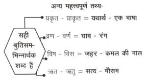 शब्दार्थ एवं समश्रुति/श्रुतिसम भिन्नार्थक शब्द तथा शब्दार्थ (Part-2)Total Questions: 5351. किस विकल्प में शब्द श्रुतिसम-भिन्नार्थक का सही अर्थ-भेद है? [उ.प्र. पुलिस कांस्टेबिल (निरस्त परीक्षा), 2024](a) प्रकृत - प्राकृत = एक भाषा यथार्थ(b) व्रण - वर्ण रंग - घाव(c) शशधर शशिधर = चाँद - शिव(d) विष - विस = धन - जहरCorrect Answer: (c) शशधर शशिधर = चाँद - शिवSolution:श्रुतिसम-भिन्नार्थक शब्द की दृष्टि से दिए गए शब्दों में से सही अर्थ-भेद वाले शब्द हैं-शशधर - शशिधर = चाँद - शिव'शशधर' अनेकार्थी शब्द भी है, जिसके अर्थ कपूर/कर्पूर तथा चन्द्रमा (चाँद) हैं।52. 'हेम' शब्द के भिन्नार्थी शब्द दिए गए हैं, जिनमें से एक विकल्प गलत है। गलत विकल्प का चयन कीजिए। [रेडियो ऑपरेटर (उ.प्र. पुलिस), परीक्षा, 2024](a) कालिमा(b) महारजत(c) कंचन(d) सोनाCorrect Answer: (a) कालिमाSolution:'हेम' संज्ञा पुल्लिंग शब्द है। यह तत्सम शब्द भी है। महारजत, कंचन तथा सोना 'हेम' के भिन्नार्थक शब्द हैं, जबकि 'कालिमा इस सन्दर्भ में गलत शब्द है।53. ऋत का अर्थ है- [UPSSSC विधानभवन रक्षक एवं वन रक्षक परीक्षा, 2016 (II)](a) सत्य(b) इत्र(c) रूप(d) कृतCorrect Answer: (a) सत्यSolution:'ऋत' का अर्थ 'सत्य' है।Submit Quiz« Previous123456