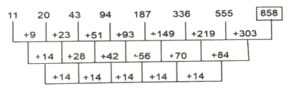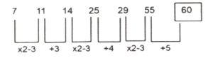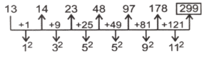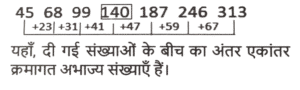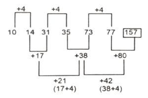 श्रृंखला (भाग-I)Total Questions: 5041. 10, 20, 23, ?, 97, 582 [SSC CHSL 25/05/2022 (Morning)](a) 53(b) 78(c) 82(d) 92Correct Answer: (d) 92Solution:42. 13, 14, 23, 48, 97, 178, ? [SSC CHSL 24/05/2022 (Evening)](a) 259(b) 278(c) 269(d) 299Correct Answer: (d) 299Solution:43. 11, 20, 43, 94, 187, 336, 555, ? [SSC CHSL 24/05/2022 (Morning)](a) 777(b) 888(c) 858(d) 758Correct Answer: (c) 858Solution:44. 458, 462, 446, 482,?, 518 [SSC CHSL 24/05/2022 (Morning)](a) 428(b) 432(c) 546(d) 418Correct Answer: (d) 418Solution:45. 7, 11, 14, 25, 29, 55,? [SSC CGL 13/04/2022 (Evening)](a) 59(b) 60(c) 95(d) 90Correct Answer: (b) 60Solution:46. LGG, PJL, KMO, OPT, LSG, ? [SSC CGL 12/04/2022 (Evening)](a) PVL(b) OVK(c) NUL(d) PUKCorrect Answer: (a) PVLSolution:47. 45, 68, 99, ?, 187, 246, 313 [SSC CGL 11/04/2022 (Evening)](a) 140(b) 117(c) 166(d) 105Correct Answer: (a) 140Solution:48. KMTC, EVOM, OQXG, IZSQ, ? [SSC CGL 11/04/2022 (Evening)](a) SUCL(b) SVCK(c) TVBK(d) SUBKCorrect Answer: (d) SUBKSolution:49. 10, 14, 31, 35, 73, 77,? [SSC CGL 11/04/2022 (Afternoon)](a) 154(b) 90(c) 157(d) 81Correct Answer: (c) 157Solution:50. 2, 5, 9, 16, 27, ?,74 [SSC MTS 26/10/2021 (Afternoon)](a) 43(b) 45(c) 48(d) 39Correct Answer: (c) 48Solution:Submit Quiz« Previous12345