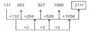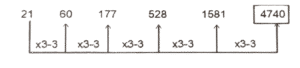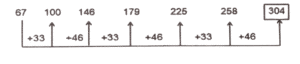श्रृंखला (भाग-IV)Total Questions: 5031. 21 60 177 528 1581 ? [SSC CHSL 01/07/2024 (4th Shift)](a) 4570(b) 4892(c) 4636(d) 4740Correct Answer: (d) 4740Solution:32. BDC, EGF, HJI, ? [SSC CHSL 02/07/2024 (1st Shift)](a) KLN(b) KLM(c) LMN(d) KMLCorrect Answer: (d) KMLSolution:33. 131, 263, 527, 1055, ? [SSC CHSL 02/07/2024 (1st Shift)](a) 1121(b) 1211(c) 2111(d) 2121Correct Answer: (c) 2111Solution:34. 67 100 146 179 225 258 ? [SSC CHSL 02/07/2024 (2nd Shift)](a) 304(b) 292(c) 318(d) 325Correct Answer: (a) 304Solution:35. YAU, DFZ, IKE, NPJ, ? [SSC CHSL 02/07/2024 (2nd Shift)](a) RUS(b) SOU(c) SRU(d) SUOCorrect Answer: (d) SUOSolution:36. 3977, 3877, 3777, 3677, 3577, ? [SSC CHSL 02/07/2024 (2nd Shift)](a) 3477(b) 3277(c) 3333(d) 3377Correct Answer: (a) 3477Solution:37. YQI CZQ GIY KRG ? [SSC CHSL 02/07/2024 (3rd Shift)](a) OAO(b) DMX(c) CNY(d) EOZCorrect Answer: (a) OAOSolution:38. 12, 26, 54, ?, 222, 446 [SSC CHSL 02/07/2024 (3rd Shift)](a) 110(b) 94(c) 88(d) 98Correct Answer: (a) 110Solution:39. 12 60 20 100 60 300 260 ? [SSC CHSL 02/07/2024 (4th Shift)](a) 1300(b) 1240(c) 1169(d) 1280Correct Answer: (a) 1300Solution:40. SLE CXS ? WVU GHI [SSC CHSL 02/07/2024 (4th Shift)](a) COR(b) HAP(c) OWG(d) MJGCorrect Answer: (d) MJGSolution:Submit Quiz« Previous12345Next »
