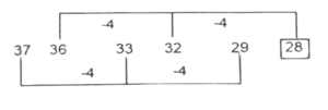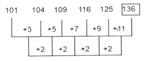 श्रृंखला (भाग-IX)Total Questions: 5011. 101 104 109 116 125 ? [SSC MTS 06/09/2023 (3rd Shift)](a) 136(b) 134(c) 135(d) 133Correct Answer: (a) 136Solution:12. JAS, HDV, FGY, DJB, ? [SSC MTS 08/09/2023 (2nd Shift)](a) DNE(b) CNF(c) BME(d) CMGCorrect Answer: (c) BMESolution:13. J_K_KKJ_K_ _K [SSC MTS 08/09/2023 (2nd Shift)](a) JJKJK(b) KJKJK(c) JKJKJ(d) KJJKJCorrect Answer: (b) KJKJKSolution:14. 37 36 33 32 29 ? [SSC MTS 08/09/2023 (2nd Shift)](a) 28(b) 26(c) 27(d) 24Correct Answer: (a) 28Solution:15. 11 59 299 1499 7499 ? [SSC MTS 11/09/2023 (1st Shift)](a) 38199(b) 37699(c) 37499(d) 38499Correct Answer: (c) 37499Solution:16. 14 47 146 443 1334 ? [SSC MTS 11/09/2023 (2nd Shift)](a) 4007(b) 4171(c) 4078(d) 4001Correct Answer: (a) 4007Solution:17. TU_T_TT_ _TU [SSC MTS 11/09/2023 (2nd Shift)](a) UTUTU(b) TTUUT(c) UUTUU(d) TUTUUCorrect Answer: (b) TTUUTSolution:18. DFZ_D_CJ DF_I_FIH DF_G [SSC MTS 11/09/2023 (3rd Shift)](a) DLFFK(b) KFFDL(c) KDFLF(d) FDFKLCorrect Answer: (b) KFFDLSolution:19. 7 16 43 ? 367 1096 3283 [SSC MTS 11/09/2023 (3rd Shift)](a) 105(b) 117(c) 124(d) 98Correct Answer: (c) 124Solution:20. 10 59 353 ? 12701 76205 457229 [SSC MTS 12/09/2023 (1st Shift)](a) 2149(b) 2247(c) 2073(d) 2117Correct Answer: (d) 2117Solution:Submit Quiz« Previous12345Next »
