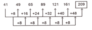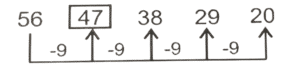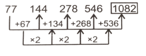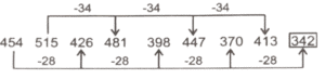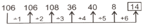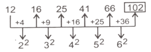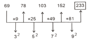 श्रृंखला (भाग-V)Total Questions: 5021. DFA, HJE, LNI, PRM, ? [SSC CHSL 08/07/2024 (1st Shift)](a) TVO(b) TVQ(c) UVP(d) UWRCorrect Answer: (b) TVQSolution:22. 56, ?, 38, 29, 20 [SSC CHSL 08/07/2024 (1st Shift)](a) 46(b) 47(c) 48(d) 42Correct Answer: (b) 47Solution:23. 106, 106, 108, 36 ,40 ,8 ? [SSC CHSL 08/07/2024 (2nd Shift)](a) 28(b) 10(c) 14(d) 22Correct Answer: (c) 14Solution:24. 77, 144, 278, 546, ? [SSC CHSL 08/07/2024 (2nd Shift)](a) 1082(b) 1208(c) 1028(d) 1802Correct Answer: (a) 1082Solution:25. 454 515 426 481 398 447 370 413 ? [SSC CHSL 08/07/2024 (3rd Shift)](a) 354(b) 326(c) 342(d) 313Correct Answer: (c) 342Solution:26. 12, 16, 25, 41, 66, ? [SSC CHSL 08/07/2024 (3rd Shift)](a) 104(b) 103(c) 102(d) 101Correct Answer: (c) 102Solution:27. ZY_WZTX_Z_XU_JXT [SSC CHSL 08/07/2024 (3rd Shift)](a) YVOZ(b) XVOZ(c) ZYOX(d) XOVZCorrect Answer: (b) XVOZSolution:28. YBP, WDS, TGQ, OLT, ? [SSC CHSL 08/07/2024 (4th Shift)](a) HTR(b) HSR(c) LSR(d) HSPCorrect Answer: (b) HSRSolution:29. 41 49 65 89 121 161? [SSC CHSL 09/07/2024 (1st Shift)](a) 209(b) 189(c) 195(d) 215Correct Answer: (a) 209Solution:30. 69, 78, 103, 152, ? [SSC CHSL 09/07/2024 (1st Shift)](a) 323(b) 233(c) 231(d) 332Correct Answer: (b) 233Solution:Submit Quiz« Previous12345Next »
