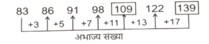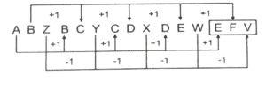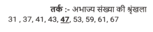 श्रृंखला (भाग-VII)Total Questions: 5011. 31, 37, 41, 43, ?, 53, 59, 61, 67 [Matriculation Level 24/06/2024 (Shift - 1)](a) 49(b) 45(c) 51(d) 47Correct Answer: (d) 47Solution:12. 6, 7, 16, 41, ?, ?, 292 [Matriculation Level 24/06/2024 (Shift - 4)](a) 90, 171(b) 95, 180(c) 100, 220(d) 115, 240Correct Answer: (a) 90, 171Solution:13. SO_T_S_F_Y_OFT_ _OFTY [Matriculation Level 24/06/2024 (Shift - 4)](a) FYOTSYS(b) SOTTY FS(c) OFSTYFO(d) YFOTSYTCorrect Answer: (a) FYOTSYSSolution:14. OTE, PUF, QVG, RWH, ? [Matriculation Level 24/06/2024 (Shift - 4)](a) SXI(b) TXI(c) TVG(d) SWGCorrect Answer: (a) SXISolution:15. WCKY, XENC, ?, ZITK, AKWO [Matriculation Level 25/06/2024 (Shift - 1)](a) YCQG(b) YGQG(c) YGSY(d) YCSYCorrect Answer: (b) YGQGSolution:16. _cb_ _amcc_eaa_cc_e_ _m [Matriculation Level 25/06/2024 (Shift - 1)](a) ceabmbea(b) caebmbea(c) caabmbaa(d) ceabmbaaCorrect Answer: (d) ceabmbaaSolution:17. ABZ, BCY, CDX, DEW,_____ [Matriculation Level 26/06/2024 (Shift - 1)](a) EGH(b) EFG(c) EFV(d) EGVCorrect Answer: (c) EFVSolution:18. 83, 86, 91, 98, ?, 122, ? [Matriculation Level 26/06/2024 (Shift - 1)](a) 90, 171(b) 92, 173(c) 109, 139(d) 98, 189Correct Answer: (c) 109, 139Solution:19. ABZY, CDXW, EFVU, ?, IJRQ [Matriculation Level 26/06/2024 (Shift - 1)](a) GHTS(b) GHUS(c) GHTT(d) FHTSCorrect Answer: (a) GHTSSolution:20. _UG_HU_EH_GE_ _G_ [Higher Secondary 20/06/2024 (Shift - 2)](a) GEHUEHU(b) EHUGHGE(c) HEGUHUE(d) HGEUGHECorrect Answer: (c) HEGUHUESolution:Submit Quiz« Previous12345Next »