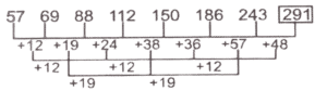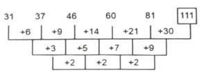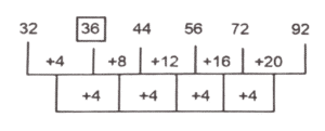 श्रृंखला (भाग-XII)Total Questions: 5041. ZBQ, BFL, ?, FNB, HRW, JVR [SSC CGL 24/07/2023 (3rd shift)](a) DKG(b) DJF(c) DJG(d) DKFCorrect Answer: (c) DJGSolution:42. 31, 37, 46, 60, 81, ? [SSC CGL 24/07/2023 (4th shift)](a) 117(b) 106(c) 122(d) 111Correct Answer: (d) 111Solution:43. BZVR, DXWQ, ?, HTYO, JRZN [SSC CGL 25/07/2023 (1st shift)](a) FXPV(b) FXPN(c) FVXP(d) FVPXCorrect Answer: (c) FVXPSolution:44. BAWP, ?, DWCH, EUFD, FSIZ [SSC CGL 25/07/2023 (3rd shift)](a) CYZL(b) CZYL(c) CLZY(d) CYZHCorrect Answer: (a) CYZLSolution:45. 57, 69, 88, 112, 150, 186, 243, ? [SSC CGL 25/07/2023 (3rd shift)](a) 286(b) 289(c) 291(d) 300Correct Answer: (c) 291Solution:46. ST_FIRSTNF _ RGSTN_IRG_ _NFI_G [SSC CGL 25/07/2023 (4th shift)](a) NGSFITR(b) NGFISRT(c) NGIFSTR(d) NGISFRTCorrect Answer: (c) NGIFSTRSolution:47. 32, ?, 44, 56, 72, 92 [SSC CGL 25/07/2023 (4th shift)](a) 34(b) 36(b) 36(d) 40Correct Answer: (b) 36Solution:48. AXY, EZW, ICU, OHS, ? [SSC CGL 25/07/2023 (4th shift)](a) UOQ(b) UPQ(c) UNQ(d) VOQCorrect Answer: (a) UOQSolution:49. 2, 10, 40, 120, 240, ? [SSC CGL 26/07/2023 (2nd shift)](a) 480(b) 300(c) 360(d) 240Correct Answer: (d) 240Solution:50. GTCL, KWEM, OZGN, SCIO, ? [SSC CGL 26/07/2023 (3rd shift)](a) VGLQ(b) WKFD(c) VJEF(d) WFKPCorrect Answer: (d) WFKPSolution:Submit Quiz« Previous12345