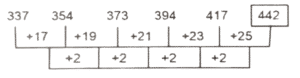 श्रृंखला (भाग-XIII)Total Questions: 5021. hf _ _ rpi _ _ xt _ pihf _ tr_ _ [Matriculation Level 30/06/2023 (Shift - 4)](a) xthfrpxi(b) xthfrxpi(c) xthfxrpi(d) xthrxpfiCorrect Answer: (b) xthfrxpiSolution:22. STAR, PUBO, ?, JWDI, GXEF [Matriculation Level 30/06/2023 (Shift - 4)](a) MVCK(b) NVCM(c) MVCL(d) NVCLCorrect Answer: (c) MVCLSolution:23. 337, 354, 373, 394, 417, ? [ SSC CHSL Tier II (26/06/2023)](a) 446(b) 444(c) 440(d) 442Correct Answer: (d) 442Solution:24. EBD, JGI, ?, TQS, YVX [SSC CHSL Tier II (26/06/2023)](a) OKN(b) OLN(c) NLO(d) NKOCorrect Answer: (b) OLNSolution:25. HCE, MHJ, ?, TOQ, VQS, WRT [SSC CHSL Tier II (26/06/2023)](a) RMO(b) RLN(c) QLN(d) QMOCorrect Answer: (c) QLNSolution:26. LAGB, NDIE, PGKH, RJMK, ? [SSC MTS 02/05/2023 (Morning)](a) TMON(b) ТМОМ(с) TMNO(d) TNONCorrect Answer: (a) TMONSolution:27. 342, 365, 388,?, 434, 457 [SSC MTS 02/05/2023 (Morning)](a) 430(b) 411(c) 425(d) 435Correct Answer: (b) 411Solution:28. 108, 129, 104, ?, 100, 137, 96 [SSC MTS 02/05/2023 (Morning)](a) 138(b) 135(c) 133(d) 140Correct Answer: (c) 133Solution:29. 7, 7, 5, 15, 11, 55, 49, 343, ? [SSC MTS 02/05/2023 (Afternoon)](a) 335(b) 293(c) 194(d) 395Correct Answer: (a) 335Solution:30. 10, 9, 17, - 10, 54, ? [SSC MTS 03/05/2023 (Afternoon)](a) - 71(b) - 82(c) - 67(d) - 103Correct Answer: (a) - 71Solution:Submit Quiz« Previous12345Next »