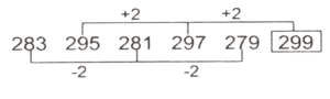 श्रृंखला (भाग-XIV)Total Questions: 501. TABQ, VCET, XEHW, ZGKZ, ? [SSC MTS 15/06/2023 (Afternoon)](a) BJMC(b) BIND(c) BJNC(d) BINCCorrect Answer: (d) BINCSolution:2. 35, 22, 43, 14, 51, ? [SSC MTS 15/06/2023 (Afternoon)](a) 6(b) 18(c) 20(d) 12Correct Answer: (a) 6Solution:3. 283, 295, 281, 297, 279, ? [SSC MTS 16/06/2023 (Evening)](a) 294(b) 298(c) 299(d) 291Correct Answer: (c) 299Solution:4. 14, 9, 4, -1, -6, ? [SSC MTS 16/06/2023 (Evening)](a) - 8(b) - 14(c) - 23(d) - 11Correct Answer: (d) - 11Solution:5. LOG, FLH, ZII, TFJ, NCK, ? [SSC CHSL 09/03/2023 (1st Shift)](a) HYL(b) HZM(c) HZL(d) HALCorrect Answer: (c) HZLSolution:6. ABC, EJN, IRY, ?, QHU [SSC CHSL 09/03/2023 (2nd Shift)](a) MYJ(b) MZJ(c) MZK(d) MZICorrect Answer: (b) MZJSolution:7. 2, 3, 5, 7, 11, ? [SSC CHSL 09/03/2023 (2nd Shift)](a) 19(b) 16(c) 20(d) 13Correct Answer: (d) 13Solution:यहाँ, 2 से शुरू होने वाली अभाज्य संख्याओं की एक श्रृंखला है, इसलिए अगली संख्या 13 होगी।8. TDS, SIJ, RNA, QSR, ? [SSC CHSL 09/03/2023 (3rd Shift)](a) PXI(b) POI(c) PYM(d) PXKCorrect Answer: (a) PXISolution:9. PQRS, VNZR, BKHQ, HHPP, ? [SSC CHSL 09/03/2023 (4th Shift)](a) NQXO(b) NEYO(c) PQRT(d) NEXOCorrect Answer: (d) NEXOSolution:10. 99986, 99996, 100096, 101096, ? [SSC CHSL 10/03/2023 (1st Shift)](a) 1110096(b) 100096(c) 111096(d) 110096Correct Answer: (c) 111096Solution:Submit Quiz12345Next »