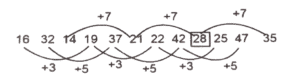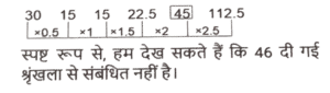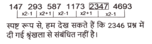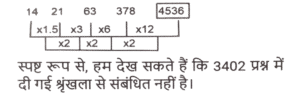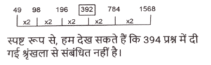 श्रृंखला (भाग-XVI)Total Questions: 5031. उस संख्या का चयन करें, जो निम्नलिखित श्रृंखला से संबंधित नहीं है। [ SSC MTS 05/07/2022 (Evening)]147, 293, 587, 1173, 2346, 4693(a) 293(b) 1173(c) 2346(d) 4693Correct Answer: (c) 2346Solution:32. उस संख्या की पहचान करें, जो निम्नलिखित श्रृंखला से संबंधित नहीं है। [SSC MTS 06/07/2022 (Evening)]46, 93, 188, 379, 764, 1529 (a) 764(b) 93(c) 188(d) 379Correct Answer: (a) 764Solution:33. उस संख्या की पहचान करें, जो निम्नलिखित श्रृंखला से संबंधित नहीं है। [SSC MTS 07/07/2022 (Morning)]49, 98, 196, 394, 784, 1568(a) 196(b) 784(c) 394(d) 1568Correct Answer: (c) 394Solution:34. उस संख्या की पहचान करें, जो निम्नलिखित श्रृंखला से संबंधित नहीं है। [SSC MTS 07/07/2022 (Morning)]14, 21, 63, 378, 3402(a) 3402(b) 14(c) 21(d) 378Correct Answer: (a) 3402Solution:35. 16, 32, 14, 19, 37, 21, 22, 42, ?, 25, 47, 35 [SSC MTS 12/07/2022 (Afternoon)](a) 34(b) 26(c) 32(d) 28Correct Answer: (d) 28Solution:36. उस संख्या की पहचान करें, जो निम्नलिखित श्रृंखला से संबंधित नहीं है। [SSC MTS 13/07/2022 (Morning)]30, 15, 15, 22.5, 46, 112.5 (a) 46(b) 112.5(c) 22.5(d) 30Correct Answer: (a) 46Solution:37. 632, 637, 644, 653, 664, ? [SSC MTS 13/07/2022 (Morning)](a) 677(b) 687(c) 679(d) 681Correct Answer: (a) 677Solution:38. GOAL, IMCJ, KKEH, MIGF, ? [SSC MTS 13/07/2022 (Morning)](a) OHID(b) OGJD(c) OGIC(d) OGIDCorrect Answer: (d) OGIDSolution:39. 28, 27, 31, 22, 38, 13, 49, ? [SSC MTS 14/07/2022 (Morning)](a) 42(b) 2(c) 0(d) 22Correct Answer: (c) 0Solution:40. ΑΕΙ, ΕΙΟ, ΙΟU, ? [SSC MTS 14/07/2022 (Morning)](a) UAE(b) ΑΕΙ(c) OUA(d) AllCorrect Answer: (c) OUASolution:Submit Quiz« Previous12345Next »