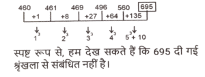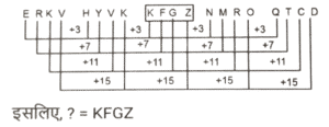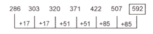 श्रृंखला (भाग-XVI)Total Questions: 5041. BY, ?, DW, EV, FU [SSC MTS 15/07/2022 (Afternoon)](a) CE(b) AX(c) AU(d) CXCorrect Answer: (d) CXSolution:42. उस संख्या की पहचान करें जो निम्नलिखित श्रृंखला से संबंधित नहीं है। [SSC MTS 18/07/2022 (Evening)]460, 461, 469, 496, 560, 695 (a) 496(b) 560(c) 469(d) 695Correct Answer: (d) 695Solution:43. 78, 112, 64, ?, 50, 140 [SSC CHSL 24/05/2022 (morning)](a) 134(b) 126(c) 108(d) 116Correct Answer: (b) 126Solution:44. XUR, WTQ, VSP, URO, ? [SSC CHSL 24/05/2022 (Morning)](a) TRP(b) TQN(c) SQO(d) SPMCorrect Answer: (b) TQNSolution:45. 286, 303, 320, 371, 422, 507, ? [SSC CHSL 24/05/2022 (Afternoon)](a) 626(b) 592(c) 602(d) 582Correct Answer: (b) 592Solution:46. S_OZQ_LO_QU_O_QVLOZ_ [SSC CHSL 24/05/2022 (Afternoon)](a) LZLZQ(b) ZLZQL(c) ZLQLZ(d) LZQZLCorrect Answer: (a) LZLZQSolution:47. DRBZ, ABKX, ?, UVCT, RFLR [SSC CHSL 24/05/2022 (Afternoon)](a) YDMC(b) YDBE(c) XUIV(d) XLTVCorrect Answer: (d) XLTVSolution:48. WFBI, UCWB, SZRU,? [SSC CHSL 24/05/2022 (Evening)](a) QWMN(b) QXNN(c) QWNN(d) QXMNCorrect Answer: (a) QWMNSolution:49. 19, 38, 35, ?, 135, 810 [SSC CHSL 24/05/2022 (Evening)](a) 146(b) 142(c) 137(d) 140Correct Answer: (d) 140Solution:50. ERKV, HYVK,?, NMRO, QTCD [SSC CHSL 25/05/2022 (Evening)](a) KFGZ(b) KSEV(c) FNQI(d) KXGWCorrect Answer: (a) KFGZSolution:Submit Quiz« Previous12345