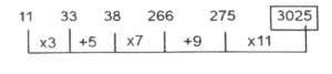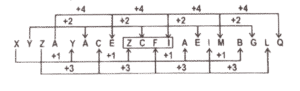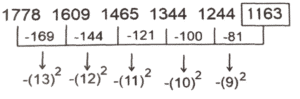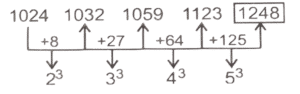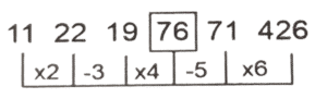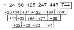 श्रृंखला (भाग-XVII)Total Questions: 5011. ΧΥΖΑ, YACE,?, AEIM, BGLQ [SSC CHSL 01/06/2022 (Afternoon)](a) 3030(b) 3035(c) 3025(d) 3020Correct Answer: (a) 3030Solution:12. 11, 33, 38, 266, 275,? [SSC CHSL 01/06/2022 (Afternoon)](a) 3030(b) 3035(c) 3025(d) 3020Correct Answer: (c) 3025Solution:13. 11, 22, 19, ?, 71, 426 [SSC CHSL 01/06/2022 (Afternoon)](a) 76(b) 80(c) 82(d) 77Correct Answer: (a) 76Solution:14. WVU, RQP, MLK, HGF, ? [SSC CHSL 01/06/2022 (Afternoon)](a) CBA(b) DCB(c) BAZ(d) DCACorrect Answer: (a) CBASolution:15. T_ _ r S S_ T T r _ _S u T T r r_ _ u [SSC CHSL 02/06/2022 (Evening)](a) TrurSSS(b) TrurTSS(c) TrurSrT(d) SrurSSSCorrect Answer: (a) TrurSSSSolution:16. 1, 24, 58, 125, 247, 446, ? [SSC CHSL 02/06/2022 (Evening)](a) 774(b) 747(c) 744(d) 777Correct Answer: (c) 744Solution:17. 1778, 1609, 1465, 1344, 1244, ? [SSC CHSL 02/06/2022 (Evening)](a) 1144(b) 1109(c) 1178(d) 1163Correct Answer: (d) 1163Solution:18. GOWB, MVEK, SCMT, ?, EQCL [SSC CHSL 02/06/2022 (Evening)](a) YKUC(b) YKCU(c) YJCU(d) YJUCCorrect Answer: (d) YJUCSolution:19. 150,154,1232,1244, 19904, ? [SSC CHSL 06/06/2022 (Afternoon)](a) 19928(b) 19925(c) 19924(d) 19926Correct Answer: (c) 19924Solution:20. 1024, 1032, 1059, 1123, ? [SSC CHSL 07/06/2022 (Afternoon)](a) 1248(b) 1252(c) 1254(d) 1250Correct Answer: (a) 1248Solution:Submit Quiz« Previous12345Next »
