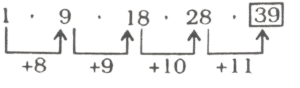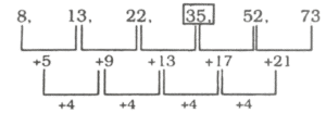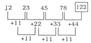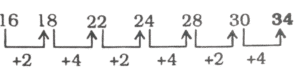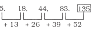 श्रृंखला (SERIES) (TYPE – I) (301 to 350)Total Questions: 501. निम्नलिखित श्रृंखला की लुप्त संख्या ज्ञात कीजिए : [RRB Group 'D' Level-I परीक्षा, 08.10.2018 (तृतीय पाली)]8, 13, 22, ?, 52, 73(1) 30(2) 32(3) 35(4) 36Correct Answer: (3) 35Solution:2. निम्न श्रृंखला की अगली संख्या ज्ञात कीजिए? [RRB Group 'D' Level-1 परीक्षा, 09.10.2018 (द्वितीय पाली)]12, 23, 45, 78,_____?(1) 128(2) 125(3) 122(4) 130Correct Answer: (3) 122Solution:3. इस श्रृंखला में अगली संख्या का पता लगाएँ। [RRB Group 'D' Level-1 परीक्षा, 10.10.2018 (प्रथम पाली)]152, 107, 72, 47, ?(1) 30(2) 18(3) 20(4) 32Correct Answer: (4) 32Solution:4. निम्नलिखित श्रृंखला में, '?' के स्थान पर कौन सी संख्या आएगी? [RRB Group 'D' Level-1 परीक्षा, 15.10.2018 (प्रथम पाली)]15, 21, 30, ?, 57(1) 45(2) 38(3) 40(4) 42Correct Answer: (4) 42Solution:5. 17, 22, 27, 32________इस श्रृंखला में 20वां पद यह होगा : [RRB Group 'D' Level-I परीक्षा, 16.10.2018 (द्वितीय पाली)](1) 107(2) 117(3) 112(4) 115Correct Answer: (3) 112Solution:17, 22, 27, 32,______a = 17, c.d (सार्वअंतर) = 22 - 17 = 5t₂₀ = 17 + (20 - 1) 5{tₙ = a + (n - 1) d}= 17 + 95 = 1126. क्रम में अगली संख्या खोजें। [RRB Group 'D' Level-1 परीक्षा, 31.10.2018 (द्वितीय पाली)]110, 89, 70, 53, 38, ?(1) 20(2) 34(3) 28(4) 25Correct Answer: (4) 25Solution:7. इस श्रृंखला में अगले अंक का पता लगाएं। [RRB Group 'D' Level-1 परीक्षा 31.10.2018 (तृतीय पाली)]5, 18, 44, 83, ?(1) 135(2) 140(3) 143(4) 138Correct Answer: (1) 135Solution:8. अगली संख्या ज्ञात कीजिए : [RRB Group 'D' CBT परीक्षा 19.09.2018 (तृतीय पाली)]34, 46, 58, 70,_____(1) 82(2) 80(3) 81(4) 78Correct Answer: (1) 82Solution:9. निम्नलिखित श्रेणी को अगली संख्या क्या होगी? [RRB Group 'D' CBT परीक्षा, 19.09.2018 (तृतीय पाली)]1,9, 18, 28,_____(1) 37(2) 39(3) 36(4) 38Correct Answer: (2) 39Solution:10. निम्न श्रृंखला में अगली संख्या ज्ञात करें। [RRB Group 'D' CBT परीक्षा, 18,09,2018 (प्रथम पाली)]16, 18, 22, 24, 28, 30, ?(1) 25(2) 30(3) 34(4) 27Correct Answer: (3) 34Solution:Submit Quiz12345Next »