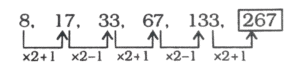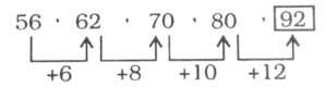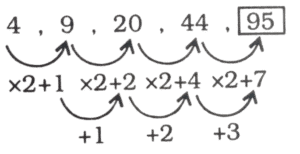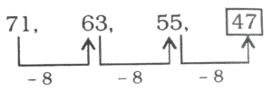 श्रृंखला (SERIES) (TYPE – I) (351 to 400)Total Questions: 5021. निम्न श्रृंखला में अगला पद क्या होगा? [RRB Group 'D' CBT परीक्षा, 26.11.2018 (प्रथम पाली)]28, 35, 34, 41,____(1) 40(2) 58(3) 48(4) 46Correct Answer: (1) 40Solution:22. निम्न श्रृंखला की अगली संख्या ज्ञात कीजिए। [RRB Group 'D' CBT परीक्षा, 26.11.2018 (प्रथम पाली)]8, 17, 33, 67, 133, ?(1) 267(2) 210(3) 260(4) 300Correct Answer: (1) 267Solution:23. दी गई श्रृंखला में अनुपस्थित पद ज्ञात करें। [RRB Group 'D' CBT परीक्षा, 28.11.2018 (प्रथम पाली)]56, 62, 70, 80,____?(1) 95(2) 92(3) 99(4) 98Correct Answer: (2) 92Solution:24. निम्नलिखित श्रृंखला को पूरा करने के लिए सही विकल्प का चयन करें। [RRB Group 'D' CBT परीक्षा, 10.12.2018 (प्रथम पाली)]2, 5, 9, 19,____?(1) 41(2) 43(3) 37(4) 36Correct Answer: (3) 37Solution:25. निम्नलिखित श्रृंखला में अगला नंबर खोजें। [RRB Group 'D' CBT परीक्षा, 10.12.2018 (प्रथम पाली)]71, 63, 55,_____?(1) 47(2) 45(3) 46(4) 48Correct Answer: (1) 47Solution:26. लुप्त अंक ज्ञात कीजिए, यदि इसके गुणक 11 और 13 हैं। [RRB ALP एवं Technician परीक्षा, 09.08.2018 (तृतीय पाली)](1) 2(2) 6(3) 8(4) 4Correct Answer: (4) 4Solution:11 × 13 = 1 4 327. निम्नलिखित श्रृंखला को पूरा करने वाली अगली संख्या बताइए। [RRB ALP एवं Technician परीक्षा, 13.08.2018 (प्रथम पाली)]0, 1, 8, 27, ?(1) 25(2) 16(3) 125(4) 64Correct Answer: (4) 64Solution:0³ = 01³ = 12³ = 83³ = 27⇒ ? = 4³ = 6428. दी गई संख्या श्रृंखला से अनुपस्थित संख्या का चयन करें। [RRB ALP एवं Technician परीक्षा, 17.08.2018 (प्रथम पाली)]4, 9, 20, 44, ?(1) 90(2) 95(3) 80(4) 100Correct Answer: (2) 95Solution:29. निम्नलिखित श्रृंखला में प्रश्न चिह्न के स्थान पर अनुपस्थित संख्या का चयन करें। [RRB ALP एवं Technician परीक्षा, 20.08.2018 (प्रथम पाली)]3, 8, 13, 18, ?(1) 23(2) 22(3) 24(4) 21Correct Answer: (1) 23Solution:30. दिए गए अनुक्रम में छूटी हुयी संख्या को विकल्पों से चुनें। [RRB ALP एवं Technician परीक्षा, 20.08.2018 (प्रथम पाली)]15, 20, 18, 23, ?, 26, 24(1) 21(2) 28(3) 24(4) 30Correct Answer: (1) 21Solution:Submit Quiz« Previous12345Next »