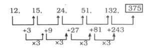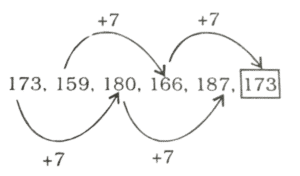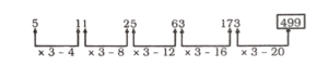 श्रृंखला (SERIES) (TYPE – I) (401 to 450)Total Questions: 5021. निम्नलिखित श्रेणी में अनुपस्थित संख्या ज्ञात कीजिए [RRB Junior Engineer परीक्षा, 26.06.2019 (तृतीय पाली)]3, 6, 11, (___), 27, 38(1) 16(2) 18(3) 20(4) 22Correct Answer: (2) 18Solution:22. श्रेणी को पूरा करें। [RRB Junior Engineer परीक्षा, 26.06.2019 (तृतीय पाली)]885, 870, 855, 840,(___)(1) 855(2) 835(3) 815(4) 825Correct Answer: (4) 825Solution:885 - 15 = 870870 - 15 = 855855 - 15 = 840840 - 15 = 82523. श्रेणी को पूर्ण करें। [RRB Junior Engineer परीक्षा, 28.06.2019 (तृतीय पाली)]4, 7, 12, 19, (___)(1) 26(2) 27(3) 28(4) 29Correct Answer: (3) 28Solution:4, 7, 12, 19___4 + 3 = 77 + 5 = 1212 + 7 = 1919 + 9 = 2824. श्रेणी को पूर्ण करें। [RRB Junior Engineer परीक्षा, 28.06.2019 (तृतीय पाली)]10, 20, 10, 9, 21, 11, 8, 22, 12, (___)(1) 8(2) 11(3) 5(4) 7Correct Answer: (4) 7Solution:25. श्रेणी को पूर्ण करें। [RRB Junior Engineer परीक्षा, 28.06.2019 (तृतीय पाली)]18, 21, 24, 27, (___)(1) 32(2) 30(3) 31(4) 29Correct Answer: (2) 30Solution:26. श्रेणी को पूर्ण करें। [RRB Junior Engineer परीक्षा, 28.06.2019 (तृतीय पाली)]2, 5, 9, 19, 37, (-)(1) 76(2) 75(3) 72(4) 74Correct Answer: (2) 75Solution:2 × 2 + 1 = 55 × 2 - 1 = 99 × 2 + 1 = 1919 × 2 - 1 = 3737 × 2 + 1 = 7527. निम्नलिखित श्रेणी में अगली संख्या चुने [RRB RPF SI एवं RPSF परीक्षा, 05.01.2019 (द्वितीय पाली)]5, 11, 25, 63, 173, ?(1) 551(2) 596(3) 692(4) 499Correct Answer: (4) 499Solution:28. निम्नलिखित श्रेणी में अगली संख्या चुनें [RRB RPF SI एवं RPSF परीक्षा, 05.01.2019 (द्वितीय पाली)]173, 159, 180, 166, 187, ?(1) 182(2) 194(3) 179(4) 173Correct Answer: (4) 173Solution:29. निम्नलिखित श्रेणी में अगली संख्या चुने [RRB RPF SI एवं RPSF परीक्षा, 05.01.2019 (द्वितीय पाली)]14, 31, 59, 121, 239, ?(1) 471(2) 478(3) 468(4) 481Correct Answer: (4) 481Solution:30. निम्नलिखित श्रेणी में अगली संख्या चुने [RRB RPF SI एवं RPSF परीक्षा, 05.01.2019 (द्वितीय पाली)]12, 15, 24, 51, 132, ?(1) 345(2) 294(3) 375(4) 268Correct Answer: (3) 375Solution:Submit Quiz« Previous12345Next »