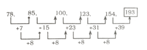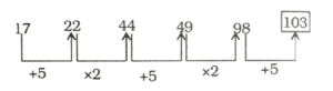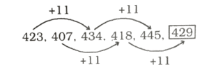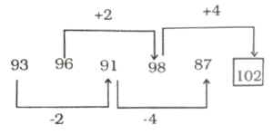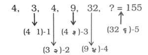 श्रृंखला (SERIES) (TYPE – I) (401 to 450)Total Questions: 5041. श्रेणी में अगली संख्या जात करें। [RRB RPF SI एवं RPSF परीक्षा, 06.01.2019 (तृतीय पाली)]17, 22, 44, 49, 98, ?(1) 100(2) 103(3) 101(4) 102Correct Answer: (2) 103Solution:42. श्रृंखला में अगला नंबर ज्ञात कीजिए। [RRB RPF SI एवं RPSF परीक्षा, 10.01.2019 (द्वितीय पाली)]7, 4, 11, 15, 26, ?(1) 78(2) 52(3) 48(4) 41Correct Answer: (4) 41Solution:7, 4, 11, 15, 26, 417 + 4 = 114 + 11 = 1511 + 15 = 2615 + 26 = 4143. श्रृंखला में अगला नंबर ज्ञात कीजिए। [RRB RPF SI एवं RPSF परीक्षा, 10.01.2019 (द्वितीय पाली)]21, 23, 43, 133, 527, ?(1) 2103(2) 2641(3) 2806(4) 2108Correct Answer: (2) 2641Solution:44. श्रृंखला में अगला नंबर ज्ञात कीजिए। [RRB RPF SI एवं RPSF परीक्षा, 10.01.2019 (द्वितीय पाली)]4, 3, 4, 9, 32, ?(1) 124(2) 155(3) 96(4) 128Correct Answer: (2) 155Solution:45. श्रृंखला में अगला नंबर ज्ञात कीजिए। [RRB RPF SI एवं RPSF परीक्षा, 10.01.2019 (द्वितीय पाली)]423, 407, 434, 418, 445, ?(1) 439(2) 461(3) 429(4) 472Correct Answer: (3) 429Solution:46. निम्न श्रृंखला में आने वाली अगली संख्या ज्ञात कीजिए: [RRB RPF SI एवं RPSF परीक्षा, 10.01.2019 (तृतीय पाली)]487, 488, 492, 501, 517, ?(1) 533(2) 532(3) 552(4) 542Correct Answer: (4) 542Solution:47. निम्न श्रृंखला में आने वाली अगली संख्या | ज्ञात कीजिए: [RRB RPF SI एवं RPSF परीक्षा, 10.01.2019 (तृतीय पाली)]93, 96, 91, 98, 87, ?(1) 96(2) 104(3) 106(4) 102Correct Answer: (4) 102Solution:48. निम्न श्रृंखला में आने वाली अगली संख्या ज्ञात कीजिए: [RRB RPF SI एवं RPSF परीक्षा, 10.01.2019 (तृतीय पाली)]38, 40, 83, 253, 1017, ?(1) 5085(2) 4092(3) 5091(4) 4073Correct Answer: (3) 5091Solution:49. निम्न श्रृंखला में आने वाली अगली संख्या ज्ञात कीजिए: [RRB RPF SI एवं RPSF परीक्षा, 10.01.2019 (तृतीय पाली)]78, 85, 100, 123, 154,?(1) 169(2) 193(3) 179(4) 185Correct Answer: (2) 193Solution:50. निम्न श्रृंखला में आने वाली अगली संख्या ज्ञात कीजिए: [RRB RPF SI एवं RPSF परीक्षा, 11.01.2019 (द्वितीय पाली)]35, 46, 59, 76, 95, ?(1) 118(2) 122(3) 120(4) 124Correct Answer: (1) 118Solution:Submit Quiz« Previous12345