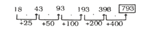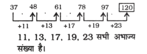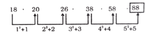 श्रृंखला (SERIES) (TYPE – I) (451 to 513)Total Questions: 6321. निम्न श्रृंखला में आने वाली अगली संख्या ज्ञात कीजिए : [RRB RPF SI एवं RPSF परीक्षा, 13.01.2019 (तृतीय पाली)]18, 20, 26, 38, 58, ?(1) 92(2) 88(3) 98(4) 104Correct Answer: (3) 98Solution:22. निम्न श्रृंखला में आने वाली अगली संख्या ज्ञात कीजिए : [RRB RPF SI एवं RPSF परीक्षा, 13.01.2019 (तृतीय पाली)]4, 17, 46, 143, 424, ?(1) 1257(2) 1701(3) 1277(4) 1696Correct Answer: (3) 1277Solution:23. निम्न श्रृंखला में आने वाली अगली संख्या ज्ञात कीजिए : [RRB RPF SI एवं RPSF परीक्षा, 13.01.2019 (तृतीय पाली)]249, 224, 237, 212, 225, ?(1) 238(2) 200(3) 213(4) 250Correct Answer: (2) 200Solution:24. निम्न श्रृंखला में आने वाली अगली संख्या ज्ञात कीजिए: [RRB RPF SI एवं RPSF परीक्षा, 16.01.2019 (द्वितीय पाली)]37, 48, 61, 78, 97, ?(1) 120(2) 115(3) 123(4) 110Correct Answer: (1) 120Solution:25. निम्न श्रृंखला में आने वाली अगली संख्या ज्ञात कीजिए: [RRB RPF SI एवं RPSF परीक्षा, 16.01.2019 (द्वितीय पाली)]17, 34, 37, 74, 77, ?(1) 148(2) 150(3) 154(4) 152Correct Answer: (3) 154Solution:26. निम्न श्रृंखला में आने वाली अगली संख्या ज्ञात कीजिए: [RRB RF SI एवं RPSF परीक्षा, 16.01.2019 (द्वितीय पाली)]16, 35, 67, 137, 271, ?(1) 545(2) 542(3) 552(4) 543Correct Answer: (1) 545Solution:27. निम्न श्रृंखला में आने वाली अगली संख्या ज्ञात कीजिए: [RRB RPF SI एवं RPSF परीक्षा, 16.01.2019 (द्वितीय पाली)]18, 43, 93, 193, 393, ?(A) 795(B) 791(C) 793(D) 797Correct Answer: (C) 793Solution:28. दिए गए विकल्पों में से उस संख्या का चयन करें, जो निम्नलिखित श्रेणी में प्रश्न चिह्न (?) के स्थान पर आ सकती है। [RRB NTPC CBT-1 परीक्षा, 30.12.2020 (प्रथम पाली)]2, 6, 12, 20, 30, 42, ?(1) 50(2) 56(3) 52(4) 60Correct Answer: (2) 56Solution:2 + 4 = 66 + 6 = 1212 + 8 = 2020 + 10 = 3030 + 12 = 4242 + 14 = 5629. दिए गए विकल्पों में से उस संख्या का चयन करें, जो निम्नलिखित श्रेणी में प्रश्न चिह्न (?) के स्थान पर आ सकती है [RRB NTPC CBT-1 परीक्षा, 30.12.2020 (प्रथम पाली)]1, 9, 25, 49, 81, ?(1) 91(2) 94(3) 121(4) 111Correct Answer: (3) 121Solution:(1)² = 1(3)² = 9(5)² = 25(7)² = 49(9)² = 81(11)² = 12130. दिए गए विकल्पों में से उस संख्या का चयन करें, जो निम्नलिखित श्रेणी में प्रश्न चिह्न (7) के स्थान पर आ सकती है। [RRB NTPC CBT-I परीक्षा, 30.12.2020 (प्रथम पाली)]3, 13, 23, 43, 53, 73, 83, 103, 113, ?(1) 153(2) 183(3) 163(4) 173Correct Answer: (3) 163Solution:3 से अंत होने वाली सतत् अभाज्य संख्याएँ दी गयी हैं।113 के बाद 3 से अंत होने वाली अभाज्य संख्या '163' है।Submit Quiz« Previous1234567Next »