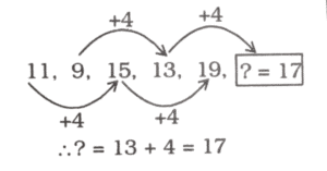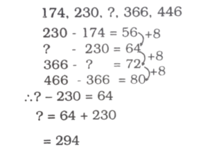 श्रृंखला (SERIES) (TYPE – I) (451 to 513)Total Questions: 6361. दिए गए विकल्पों में से उस संख्या का चयन कीजिए, जो निम्नलिखित श्रृंखला में प्रश्न चिह्न (?) के स्थान पर आ सकती है। [RRB NTPC CBT-I परीक्षा, 23.07.2021 (प्रथम पाली)]11, 9, 15, 13, 19, ?(1) 25(2) 17(3) 7(4) 21Correct Answer: (2) 17Solution:62. दिए गए विकल्पों में से उस भिन्न का चयन कीजिए, जो निम्नलिखित श्रृंखला में प्रश्न चिन्ह (?) के स्थान पर आ सकता है। [RRB NTPC CBT-I परीक्षा, 23.07.2021 (प्रथम पाली)]1/25, 1/49, 1/81, ?(1) 1/100(2) 1/121(3) 1/169(4) 1/64Correct Answer: (2) 1/121Solution:1/25, 1/49, 1/81, ?भिन्न के हर से, 25 = 5²49 = 7²81 = 9²प्रत्येक भिन्न का हर विषम संख्या का वर्ग है जो '5' से शुरू होकर आगे की ओर बढ़ता है .. अलग हर = (11)² = 121अभीष्ट अगला भिन्न = 1/12163. दिए गए विकल्पों में से उस संख्या का चयन कीजिए, जो निम्नलिखित श्रृंखला में प्रश्नचिन्ह (?) के स्थान पर आ सकती है। [RRB NTPC CBT-I परीक्षा, 23.07.2021 (प्रथम पाली)]174, 230, ?, 366, 446(1) 256(2) 284(3) 361(4) 294Correct Answer: (4) 294Solution:Submit Quiz« Previous1234567