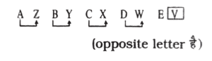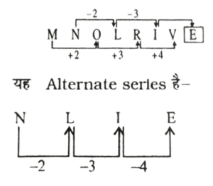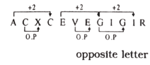 श्रृंखला (SERIES) (TYPE – II) (01 to 50)Total Questions: 5011. निम्न अक्षर श्रेणियों में लुप्त स्थानों की पूर्ति कीजिए। [आरआरबी त्रिवेन्द्रम नन-टेक्निकल परीक्षा 26.06.1997]M N O L R I V -(1) Η(2) K(3) E(4) SCorrect Answer: (3) ESolution:12. निम्न अक्षर श्रेणियों में लुप्त स्थानों की पूर्ति कीजिए। [आरआरबी त्रिवेन्द्रम नन-टेक्निकल परीक्षा 26.06.1997]C₄ K₂ 0₃ -(1) M(2) N(3) T(4) UCorrect Answer: (4) USolution:C₄ = C के बाद 4 × 2 = 8वाँ अक्षर अर्थात् -'K' ;K₂ = K के बाद 2 × 2 = 4 था अक्षर अर्थात् - 'O' ;O₃ = O के बाद 3 × 2 = 6 ठा अक्षर अर्थात् - 'U' होगा।13. निम्नलिखित अक्षर क्रम में दिए गये उत्तरों में से अगला अक्षर कौन-सा होगा- [आरआरबी कोलकाता सहायक स्टेशन मास्टर परीक्षा 04.01.1998]GIJJLMMOPP-(1) Ο(2) P(3) R(4) MCorrect Answer: (3) RSolution:14. निम्नलिखित अक्षर क्रम में दिए गये उत्तरों में से अगला अक्षर कौन-सा होगा- [आरआरबी कोलकाता सहायक स्टेशन मास्टर परीक्षा 04.01.1998]BFJNRVZDHL-(1) M(2) T(3) Ο(4) PCorrect Answer: (4) PSolution:15. निम्नलिखित अक्षर क्रम में दिए गये उत्तरों में से अगला अक्षर कौन-सा होगा- [आरआरबी कोलकाता सहायक स्टेशन मास्टर परीक्षा 04.01.1998]AZBYCXDWE-(1) V(2) F(3) U(4) WCorrect Answer: (1) VSolution:16. निम्नलिखित अक्षर क्रम में दिए गये उत्तरों में से अगला अक्षर कौन-सा होगा- [आरआरबी कोलकाता सहायक स्टेशन मास्टर परीक्षा 04.01.1998]ACXCEVEGTG-(1) SJ(2) RI(3) IR(4) SRCorrect Answer: (3) IRSolution:17. निम्नलिखित अक्षर क्रम में दिए गये उत्तरों में से अगला अक्षर कौन-सा होगा- [आरआरबी कोलकाता सहायक स्टेशन मास्टर परीक्षा 04.01.1998]XYZABCUVW-(1) F(2) G(3) E(4) DCorrect Answer: (4) DSolution:18. निम्नांकित श्रृंखला में प्रश्नचिह्न (?) के स्थान पर क्या आयेगा? [आरआरबी बंगलौर नन-टेक्निकल परीक्षा 22.08.1999]ACD, EGH, ?, MOP(1) JLM(2) IJK(3) IKL(4) KLMCorrect Answer: (3) IKLSolution:19. नीचे दी गई श्रेणी में निम्न में से कौन अगले स्थान पर आयेगा? [आरआरबी सिकंदराबाद सहायक स्टेशन मास्टर परीक्षा 24.06.2001]nsi, org, pqe, qpc,____(1) rqd(2) aor(3) pqa(4) roaCorrect Answer: (4) roaSolution:20. निम्नलिखित अक्षर क्रम में प्रश्नचिह्न (?) के स्थान पर कौन से अक्षर आयेंगे ? [आरआरबी इलाहाबाद सहायक स्टेशन मास्टर परीक्षा 08.07.2001]Ixf mtj npn olr ?(1) PHV(2) PPV(3) PIU(4) इनमें से कोई नहींCorrect Answer: (1) PHVSolution:Submit Quiz« Previous12345Next »