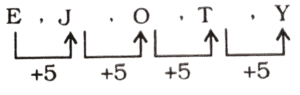 श्रृंखला (SERIES) (TYPE – II) (201 to 258)Total Questions: 5811. निम्नलिखित श्रृंखला में, एक शब्द गायब है जैसा कि प्रश्न चिह्न (?) द्वारा दिखाया गया है। दिए गए विकल्पों के लापता शब्द का चयन करें। [RRB ALP एवं Technician परीक्षा, 10.08.2018 (प्रथम पाली)]A, BC, DEF, GHIJ, ?(1) ΧΥΖΑ(2) PQRS(3) KLMNO(4) TUVWCorrect Answer: (3) KLMNOSolution:12. निम्नलिखित श्रृंखला में, प्रश्न चिह्न (?) द्वारा दिखाए गए पद पर एक अक्षर अनुपस्थित है। दिए गए विकल्पों से अनुपस्थित अक्षर का चयन करें। [RRB ALP एवं Technician परीक्षा, 13.08.2018 (प्रथम पाली)]Q, O, L, H, ?(1) D(2) A(3) B(4) CCorrect Answer: (4) CSolution:13. दी गयी श्रृंखला का लुप्त पद चुनें। [RRB ALP एवं Technician परीक्षा, 13.08.2018 (तृतीय पाली)]PG, GH, RI, ?(1) JK(2) LT(3) SJ(4) STCorrect Answer: (3) SJSolution:14. निम्नलिखित श्रृंखला में, प्रश्न चिन्ह (?) द्वारा दिखाए गए अनुसार एक अक्षर अनुपस्थित है। दिए गए विकल्पों से अनुपस्थित अक्षर का चयन करें। [RRB ALP एवं Technician परीक्षा, 14.08.2018 (प्रथम पाली)]E, J, O, T, ?(1) X(2) Y(3) W(4) ZCorrect Answer: (2) YSolution:15. दी गई श्रृंखला के अगले दो पद ज्ञात कीजिए- [RRB ALP एवं Technician परीक्षा, 20.08.2018 (तृतीय पाली)]J, L, O, S, ?, ?(1) Y, B(2) X, Z(3) X, D(4) A, BCorrect Answer: (3) X, DSolution:16. दी गई श्रृंखला का अगला पद ज्ञात कीजिए- [RRB ALP एवं Technician परीक्षा, 20.08.2018 (तृतीय पाली)]X, V, T, R, P, ?(1) H(2) L(3) Ο(4) NCorrect Answer: (4) NSolution:17. निम्नलिखित श्रृंखला में प्रश्न चिह्न (?) द्वारा दिखाया गया अक्षर अनुपस्थित है। दिए गए विकल्पों से अनुपस्थित अक्षर का चयन करें। [RRB ALP एवं Technician परीक्षा, 21.08.2018 (तृतीय पाली)]I, L, O, R, ?(1) X(2) V(3) W(4) UCorrect Answer: (4) USolution:18. निम्नलिखित श्रृंखला में, प्रश्न चिह्न (?) के स्थान पर आने वाले अक्षर का चयन करें। [RRB ALP एवं Technician परीक्षा, 29.08.2018 (प्रथम पाली)]D, G, K, ?, V(1) P(2) R(3) L(4) MCorrect Answer: (1) PSolution:19. निम्नलिखित क्रम से लापता पद का चयन करें। [RRB ALP एवं Technician परीक्षा, 31.08.2018 (तृतीय पाली)]GPW, GPUW, GIPUW, GIPSUW,_____(1) GIPKSUW(2) GIJPSUW(3) GIKPSW(4) GIKPSUWCorrect Answer: (4) GIKPSUWSolution:20. निम्नलिखित श्रृंखला में, प्रश्न चिह्न (?) द्वारा दिखाए गए अनुसार एक पद अनुपस्थित है। दिए गए विकल्पों से अनुपस्थित पद का चयन करें। [RRB ALP एवं Technician परीक्षा, 31.08.2018 (तृतीय पाली)]AZ, BY, CX, DW, ?(1) EV(2) EX(3) EY(4) EWCorrect Answer: (1) EVSolution:Submit Quiz« Previous123456Next »