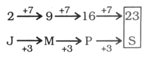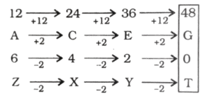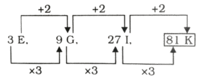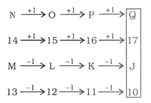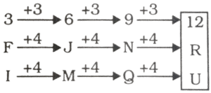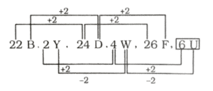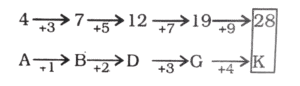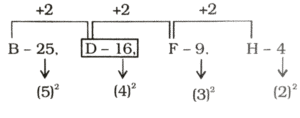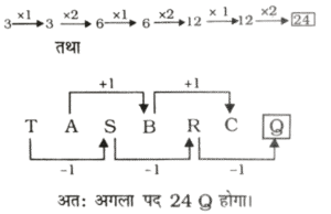 श्रृंखला (SERIES) (TYPE – V) (51 to 100)Total Questions: 5021. निम्नलिखित श्रृंखला में प्रश्नचिन्ह की जगह कौन-सा पद आएगा। [RRB Group 'D' Level-1 परीक्षा, 18.09.2018 (द्वितीय पाली)]B-25, ?, F-9, H-4(1) S-18(2) D-20(3) T-19(4) D-16Correct Answer: (4) D-16Solution:22. निम्नलिखित श्रेणी में अगला पद क्या होगा? [RRB Group 'D' Level-I परीक्षा, 18.09.2018 (द्वितीय पाली)]12A6Z, 24C4X, 36E2V,______(1) 48GOT(2) 48FOT(3) 48F9T(4) 48F9SCorrect Answer: (1) 48GOTSolution:23. नीचे दी गई पदों की श्रृंखला में अगला पद क्या होगा? [RRB Group 'D' Level-1 परीक्षा, 19.09.2018 (द्वितीय पाली)]3E, 9G, 27 I_____.(1) 81K(2) 80L(3) 80K(4) 81LCorrect Answer: (1) 81KSolution:24. नीचे दी गई पदों की श्रृंखला में अगला पद क्या होगा? [RRB Group 'D' Level-1 परीक्षा, 19.09.2018 (द्वितीय पाली)]3T, 3A, 6S, 6B, 12R, 12C, ?(1) 24Q(2) 24U(3) 24T(4) 24SCorrect Answer: (1) 24QSolution:25. निम्नलिखित श्रेणी में अगला पद क्या होगा? [RRB Group 'D' Level-1 परीक्षा, 20.09.2018 (द्वितीय पाली)]22B, 2Y, 24D, 4W, 26F,______.(1) 6V(2) 6U(3) 6Y(4) 69Correct Answer: (2) 6USolution:26. निम्नलिखित श्रृंखला में अगला पद ज्ञात करें। [RRB Group 'D' Level-1 परीक्षा, 22.09.2018 (तृतीय पाली)]4A, 7B, 12D, 19G, ?(1) 28 K(2) 27 G(3) 28 P(4) 26 UCorrect Answer: (1) 28 KSolution:27. नीचे दी गयी श्रृंखला में अगला पद ज्ञात कीजिए। [RRB Group 'D' Level-I परीक्षा, 25.09.2018 (तृतीय पाली)]2J, 9M, 16P,____,_____(1) 23 R(2) 20 R(3) 22 R(4) 23 SCorrect Answer: (4) 23 SSolution:28. निम्नलिखित श्रृंखला में अगला पद क्या होगा? [RRB Group 'D' Level-1 परीक्षा, 25.09.2018 (तृतीय पाली)]N14M13, O15L12, P16K11,____(1) Q17J10(2) J10Q17(3) Q18J10(4) Q17J13Correct Answer: (1) Q17J10Solution:29. निम्नलिखित श्रेणी में अगला पद क्या होगा? [RRB Group 'D' Level-I परीक्षा, 29.09.2018 (प्रथम पाली)]24X, 22V, 20T,_____(1) 16P(2) 18R(3) R18(4) P16Correct Answer: (2) 18RSolution:30. नीचे दी गई पदों की श्रृंखला में अगला पद् क्या होगा? [RRB Group 'D' Level-I परीक्षा, 27.09.2018 (तृतीय पाली)]3F1, 6JM, 9NQ,_____(1) 8 RS(2) 8RU(3) 12PQ(4) 12RUCorrect Answer: (4) 12RUSolution:Submit Quiz« Previous12345Next »