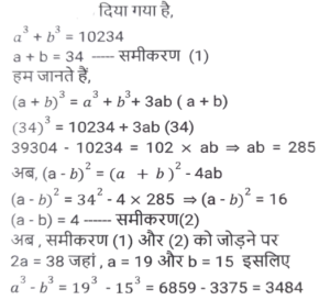 संख्या पद्धति (भाग-IV)Total Questions: 5031. दी गई दो संख्याओं के घनों का योग 10234 है, जबकि दी गई दो संख्याओं का योग 34 है। दी गई दो संख्याओं के घनों के बीच का धनात्मक अंतर क्या है? [SSC CHSL 11/08/2023 (1st Shift)](a) 3484(b) 3488(c) 3356(d) 8602Correct Answer: (a) 3484Solution:32. छः अंकों की संख्या N = 4a6b9c, 99 से विभाज्य है, तो N के अंकों का अधिकतम योग कितना है? [SSC CHSL 17/08/2023 (1st Shift)](a) 18(b) 36(c) 45(d) 27Correct Answer: (d) 27Solution:दिया गया है, N = 4a6b9c N, 99 से विभाज्य है इसलिए यह 9 और 11 दोनों से विभाज्य होगा(4 + 6 + 9) - (a + b + c) = 19 - (a + b + c) यदि a + b + c = 8 तब N, 11 और 9 दोनों से विभाज्य हैअतः N के अंकों का योग = 19 + 8 = 2733. (265)⁴⁰⁸¹ + 9 को 266 से विभाजित करने पर प्राप्त शेषफल ज्ञात कीजिए । [SSC CGL 14/07/2023 (1st shift)](a) 8(b) 6(c) 1(d) 9Correct Answer: (a) 8Solution:34. A और B के पास कुछ टॉफियाँ हैं। यदि A, B को एक टॉफी देता है, तो उनके पास बराबर संख्या में टॉफियां हो जाती हैं। यदि B, A को एक टॉफ़ी देता है, तो A की टॉफियां B से दोगुनी हो जाती हैं। A और B के पास टॉफियों की कुल _____________संख्या है। [SSC CGL 14/07/2023 (3rd shift)](a) 12(a) 12(c) 14(d) 15Correct Answer: (a) 12Solution:माना A के पास x संख्या में टॉफियां हैं और B के पास y संख्या में टॉफियाँ हैं।प्रश्न के अनुसार,शर्त 1 :- x - 1 = y + 1x = y + 2 ......समीकरण (1)शर्त 2 :- x + 1 = 2 (y - 1)x - 2y = - 3 ,y + 2 - 2y = - 3 (समीकरण 1 से)y = 5 और x = 7टॉफियों की कुल संख्या = 5 + 7 = 1235. वह छोटी से छोटी संख्या ज्ञात कीजिए जिसे 148109326 में से घटाने पर प्राप्त संख्या 8 से विभाज्य होगी। [SSC CGL 17/07/2023 (1st shift)](a) 4(b) 8(c) 6(d) 10Correct Answer: (c) 6Solution:8 के विभाज्यता का नियम = संख्या के अंतिम 3 अंक 8 से विभाज्य होंगे।संख्या के अंतिम तीन अंक = ......... 326 - 6= ...... 320 (8 से विभाज्य)अतः अभीष्ट संख्या = 6 होगी36. 88 से पूर्णतः विभाज्य 5 अंकों की सबसे बड़ी संख्या ज्ञात कीजिए। [SSC CGL 17/07/2023 (2nd shift)](a) 99990(b) 99984(c) 99978(d) 99968Correct Answer: (d) 99968Solution:5 अंकों की सबसे बड़ी संख्या = 99999प्रश्न के अनुसार, 99999/88 ⇒ शेष = 31आवश्यक संख्या = 9999931 - 31 = 9996837. छह अंकों की एक संख्या 33 से विभाज्य है। यदि संख्या में 54 जोड़ दिया जाए, तो निर्मित नई संख्या भी _____________से विभाज्य होगी। [SSC CGL 17/07/2023 (4th shift)](a) 3(b) 2(c) 5(d) 7Correct Answer: (a) 3Solution:माना छह अंकों की संख्या जो 33 (11 × 3) से विभाज्य है, 111111 हैइसमें 54 जोड़ने के बाद नया नंबर = 111165 अब, विकल्प की जाँच करके,संख्या (111165), 3 से विभाज्य है।38. 32 पेनों और 12 पेंसिलों का मूल्य ₹790 है। 8 पेनों और 3 पेंसिलों का कुल मूल्य (₹ में) कितना होगा ? [SSC CGL 18/07/2023 (2nd shift)](a) 200.5(b) 197.5(c) 180.5(d) 220.5Correct Answer: (b) 197.5Solution:32 पेन और 12 पेंसिल की लागत = 790 रुपये।4 से भाग देने पर हमें प्राप्त होता है,32 पेन /4 और 12 पेंसिल /4 की लागत= 790 रुपये/4 = 197.5 रुपये8 पेन और 3 पेंसिल की लागत = 197.5 रुपये39. दो संख्याओं का योग 98 है। दोनों संख्याओं का अंतर 28 है। दोनों संख्याओं में से एक संख्या ज्ञात कीजिए। [SSC CGL 19/07/2023 (3rd shift)](a) 32(b) 62(c) 58(d) 35Correct Answer: (d) 35Solution:माना कि संख्याएँ a और b हैं।प्रश्न के अनुसार,a + b = 98 ........ समी. (1)और a - b = 28 .........समी. (2)दोनों समीकरणों को जोड़ने पर, हमें प्राप्त होता है2a=98+28 ⇒ a = 126/2 = 63दूसरी संख्या (b) = 98 - 63 = 3540. 484 के उन भाजकों का योग कितना है जो पूर्ण वर्ग हैं? [SSC 
