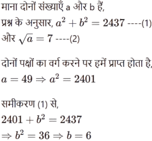 2. यदि दो धनात्मक संख्याओं के वर्गों का योग 2437 है और एक संख्या का वर्गमूल 7 है, तो दूसरी संख्या ज्ञात कीजिए। [RRB NTPC 08/01/2021 (Evening)]