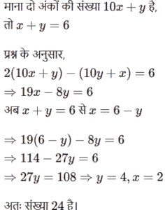 5. दो अंकों की एक संख्या के अंकों का योग 6 है। यदि अंकों को उलट दिया जाता है, तो नई संख्या मूल संख्या के दुगने से 6 कम होती है। वह संख्या ज्ञात कीजिए। [RRB NTPC 09/01/2021 (Morning)]