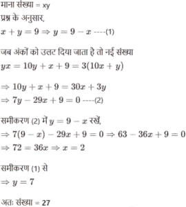 7. दो अंकों की एक संख्या के अंकों का योग 9 है। यदि अंकों को उलट दिया जाए तो 9 की वृद्धि करने पर यह मूल संख्या के तीन गुना हो जाती है। संख्या ज्ञात कीजिए। [RRB NTPC 09/01/2021 (Evening)]