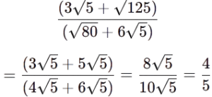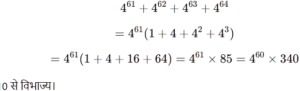 संख्या पद्धति-रेलवे गणित Part-4Total Questions: 5021. 61827354 में 6 और 5 के जातीय मान का योग ज्ञात कीजिए। [RRB NTPC 12/01/2021 (Evening)](a) 30 (b) 11 (c) 40 (d) 60000300Correct Answer: (d) 60000300Solution:दी गई संख्या = 61827356 का जातीय मान = 65 का जातीय मान = 5योग = 6 + 5 = 1122. निम्नलिखित में से कौन-सी संख्या, जब स्वयं में 14 बार जोड़ी जाती है, तो परिणाम के रूप में 135 देती है? [RRB NTPC 12/01/2021 (Evening)](a) 9 (b) 12(c) 11 (d) 8Correct Answer: (b) 12Solution:मान लीजिए संख्या =xप्रश्न के अनुसार, x+14x=135 15x=135⇒x=923. संख्या 1.112123123412345 एक _______ है [RRB NTPC 13/01/2021 (Morning)](a) अपरिमेय संख्या (b) प्राकृतिक संख्या (c) परिमेय संख्या (d) पूर्णांकCorrect Answer: (a) अपरिमेय संख्या Solution:संख्या 1.112123123412345 एक अपरिमेय संख्या है क्योंकि 1234 दशमलव के बाद दोहरा रहा है।24. जब किसी संख्या को 45 से विभाजित किया जाता है, तो 28 शेष बचता है। उसी संख्या को 15 से विभाजित करने पर शेषफल होता है [RRB NTPC 13/01/2021 (Morning)](a) 13 (b) 12 (c) 11 (d) 10Correct Answer: (a) 13 Solution:45, 15 से विभाज्य है इसलिए जो संख्या 45 से विभाज्य है, वह भी 15 से विभाज्य होगी।हमें केवल शेष की जाँच करने की आवश्यकता है।जब हम 28 को 15 से भाग देते हैं, तो शेष = 1325. मान लीजिए N सबसे बड़ी संख्या इस प्रकार है कि जब 1300, 4660 और 6900, N से विभाज्य हों, तो शेषफल वही रहता है। N में अंकों का योग कितना है? [RRB NTPC 13/01/2021 (Morning)](a) 3 (b) 5 (c) 4(d) 6Correct Answer: (c) 4Solution:4660 - 1300 = 33606900 - 4660 = 22402240 और 3360 का HCF = 112 N = 112, अंकों का योग = 1 + 1 + 2 = 4.26. मान ज्ञात कीजिए। [RRB NTPC 13/01/2021 (Morning)](a) एक अपरिमेय संख्या(b) एक परिमेय संख्या(c) पूर्णांक(d) एक प्राकृतिक संख्याCorrect Answer: (b) एक परिमेय संख्याSolution:(परिमेय संख्या)27. एक संख्या का 1/4, दूसरी संख्या के 3/8 के बराबर है। यदि पहली संख्या में 30 जोड़ा जाए, तो वह दूसरी संख्या का छह गुणा हो जाती है। पहली संख्या है — [RRB NTPC 13/01/2021 (Evening)](a) 10 (b) 12 (c) 15 (d) 20Correct Answer: (a) 10 Solution:माना दो संख्याएँ Nऔर M हैं।N का एक चौथाई M के तीन-आठवें के बराबर है। यदि पहली संख्या में 30 जोड़ दिया जाता है, तो यह दूसरी संख्या का छह गुना हो जाती है। N+30=6×M⇒3N=30⇒N=10 तो, पहली संख्या 10 है।28. श्रृंखला 4, 8, 16, 32, ———512 में पदों की संख्या ज्ञात कीजिए। [RRB NTPC 13/01/2021 (Evening)](a) 7 (b) 10 (c) 9(d) 8Correct Answer: (d) 8Solution:4, 8, 16, 32, …, 512यह श्रेणी ज्यामितीय अनुक्रम में है, जहाँ a=4,r=2,l=512 l=a×rⁿ⁻¹ 2ⁿ⁻¹=2⁷⇒n=8 29. वह छोटी से छोटी संख्या ज्ञात कीजिए जिसे 0.000327 में से घटाकर उसे एक पूर्ण वर्ग बनाया जा सकता है? [RRB NTPC 16/01/2021 (Morning)](a) 0.03 (b) 0.000004 (c) 0.04(d) 0.000003Correct Answer: (d) 0.000003Solution:यदि हम दी गई संख्या का अवलोकन करें तो हम पाते हैं कि 327 की निकटतम संख्या जो एक पूर्ण वर्ग होगी, 324 है। 0.000327−0.000324=0.000003030. निम्न में से कौन-सी संख्या ( 4⁶¹ + 4⁶² + 4⁶³ + 4⁶⁴ ) को पूर्ण रूप से विभाजित करेगी? [RRB NTPC 16/01/2021 (Morning)](a) 10 (b) 13 (c) 11 (d) 3Correct Answer: (a) 10 Solution:Submit Quiz« Previous12345Next »
