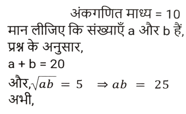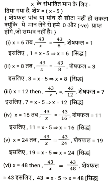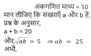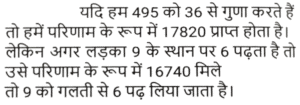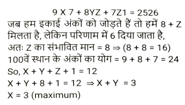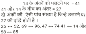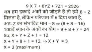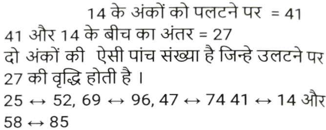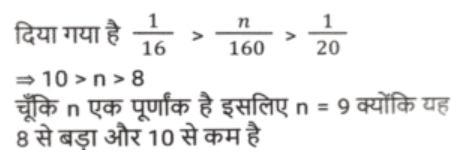 संख्या पद्धति-रेलवे गणितTotal Questions: 5021. जब आप संख्या 14 के अंकों को उलट देते हैं, तो संख्या 27 बढ़ जाती है। कितनी अन्य दो अंकों की संख्याएं 27 से बढ़ जाती हैं, जब उनके अंक उलट दिए जाते हैं? [NTPC CBT-1 22/01/2021 (Evening)](a) 4(b) 6(c) 7(d) 5Correct Answer: (d) 5Solution:22. एक लड़के को 495 को 36 से गुणा करने का निर्णय लिया, लेकिन प्रश्नों में से एक अंक को गलत तरीके से पढ़ने पर, उसे अपने उत्तर के रूप में 16740 प्राप्त हुआ। उसने गलती से कौन सा अंक पढ़ा? [NTPC CBT-1 27/01/2021 (Evening)](a) 9(b) 8(c) 2(d) 7Correct Answer: (a) 9Solution:23. मान लीजिये कि A = 1 B = 2 और इसी तरह आगे भी ..... z = 26 , निम्नलिखित समीकरण का मान ज्ञात कीजिए [NTPC CBT-1 12/02/2021 (Morning)](I ² - C²× P/R) + 8(a) 90(b) 73(c) 81(d) 78Correct Answer: (c) 81Solution:24. सरल कीजिये ? [NTPC CBT-1 16/02/2021 (Evening)](a) 47/150(b) 49/50(c) 49/150(d) 47/50Correct Answer: (c) 49/150Solution:25. यदि दो संख्याओं का योग है और उनका भागफल s/t है तो संख्याएँ क्या हैं? [NTPC CBT-1 17/02/2021 (Morning)](a) (r/s) और (r/t)(b) (sr)/(s + t) और (tr)/(s + t)(c) (rs)/(t) और (ts)/(r)(d) (r - s)/(t) और (r - t)/(s)Correct Answer: (b) (sr)/(s + t) और (tr)/(s + t)Solution:26. यदि दो प्रेक्षणों के समांतर माध्य और ज्यामितीय माध्य क्रमशः 10 और 5 हैं, तो प्रेक्षणों के वर्गों का योग ज्ञात कीजिए। [NTPC CBT-1 11/03/2021 (Evening)](a) 295(d) 350(b) 275(c) 225Correct Answer: (d) 350Solution:27. पूर्णांक n इस प्रकार निर्धारित करें कि n/160, 1/16, से कम लेकिन 1/20 से अधिक हो। [NTPC CBT-1 11/03/2021 (Evening)](a) 7(b) 8(c) 6(d) 9Correct Answer: (d) 9Solution:28. दिए गए समीकरण में x और Z का उच्चतम मान क्या होगा? [NTPC CBT-1 02/03/2021 (Evening)]9X7 + 8YZ + 7Z1 = 2526(a) X = 7 z = 8(b) x = 9 z = 2(c) x = 9 z = 1(d) x = 3 z = 8Correct Answer: (d) x = 3 z = 8Solution:29. यदि P एक अभाज्य संख्या है और P, Q² को विभाजित करता है, तो P आवश्यक रूप से विभाजित नहीं करेगा: [NTPC CBT-1 27/03/2021 (Morning)](a) 3Q(b) Q + 1(c) 2Q²(d) QCorrect Answer: (b) Q + 1Solution:30. जब 43 को x से विभाजित किया जाता है, तो शेषफल x - 5 होता है। यदि x एक प्राकृत संख्या है, तो x के कितने हल होंगे? [NTPC CBT-1 23/07/2021 (Evening)](a) 5(b) 4(c) 6(d) 3Correct Answer: (c) 6Solution:Submit Quiz« Previous12345Next »