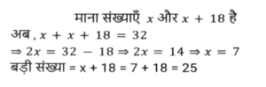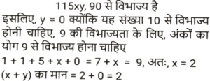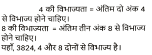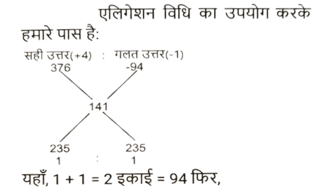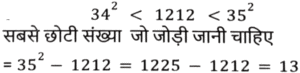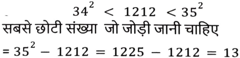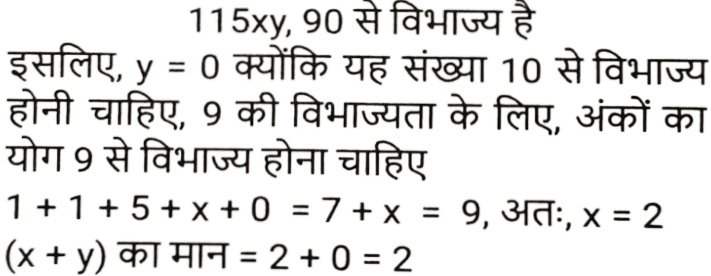 संख्या पद्धति-रेलवे गणितTotal Questions: 5031. X, 94 प्रश्न के उत्तर देता है और उसे 141 अंक मिलते हैं। यदि प्रत्येक सही प्रश्न के लिए 4 अंक दिए जाते हैं और प्रत्येक गलत उत्तर के लिए 1 अंक काटा जाता है तो x द्वारा दिए गए गलत उत्तरों की संख्या_______है। [RRB ALP Tier - 1 17/08/2018 (Morning)](a) 45(b) 57(c) 47(d) 40Correct Answer: (c) 47Solution:32. निम्नलिखित में से कौन 4 और 8 दोनों से विभाज्य है? [Group D 17/08/2022 (Afternoon)](a) 4382(b) 8342(c) 3824(d) 3842Correct Answer: (c) 3824Solution:33. 2 और 4 दोनों से विभाज्य 2-अंकीय संख्याओं की संख्या ज्ञात कीजिए। [Group D 17/08/2022 (Evening)](a) 12(b) 42(c) 22(d) 32Correct Answer: (b) 42Solution:34. यदि x और y, संख्या 115xy के ऐसे दो अंक हैं कि यह संख्या 90 से विभाज्य है, तो x + y का मान ज्ञात कीजिये। [Group D 18/08/2022 (Morning)](a) 3(b) 2(c) 6(d) 5Correct Answer: (b) 2Solution:35. 1212 को एक पूर्ण वर्ग बनाने के लिए उसमें जो सबसे छोटी प्राकृत संख्या जोड़ी जाए वह कौन सी है? [Group D 18/08/2022 (Afternoon)](a) 13(b)27(c)18(d) 24Correct Answer: (a) 13Solution:36. निम्नलिखित में से कौन सी संख्या जोड़ी सह-अभाज्य हैं? [Group D 18/08/2022 (Afternoon)](a) 34 और 35(b) 17 और 170(c) 12 और 18(d) 7 और 14Correct Answer: (a) 34 और 35Solution:37. वह सबसे छोटी संख्या ज्ञात कीजिए जिसे 6300 को गुणा करने पर यह एक पूर्ण वर्ग बन जाए। [Group D 18/08/2022 (Afternoon)](a) 6(b) 12(c) 15(d) 7Correct Answer: (d) 7Solution:38. दो संख्याओं का योग 32 है और उनमें से एक संख्या दूसरी संख्या से 18 अधिक है। बड़ी संख्या ज्ञात कीजिए। [Group D 18/08/2022 (Evening)](a) 27(b) 25(c) 28(d) 24Correct Answer: (b) 25Solution:39. निम्नलिखित में से कौन सा युग्म सह -अभाज्य नहीं है? [Group D 18/08/2022 (Evening)](a) (11, 13)(b) (15, 17)(c) (17, 23)(d) (17, 34)Correct Answer: (d) (17, 34)Solution:40. मोहित का वेतन ₹15,000 प्रति माह है। वह घर के किराए पर ₹5,000, बिलों पर ₹2000 खर्च करता है और शेष राशि उसकी मासिक बचत है। यदि उसने अपने जन्मदिन के महीने में अपनी पूरी मासिक बचत जन्मदिन मनाने के लिए खर्च कर देता है, तो एक वर्ष में उसके द्वारा की गयी बचत ज्ञात कीजिये। [Group D 18/08/2022 (Evening)](a) ₹88,000(b) ₹8,000(c) ₹17,000(d) ₹ 96,000Correct Answer: (a) ₹88,000Solution:Submit Quiz« Previous12345Next »